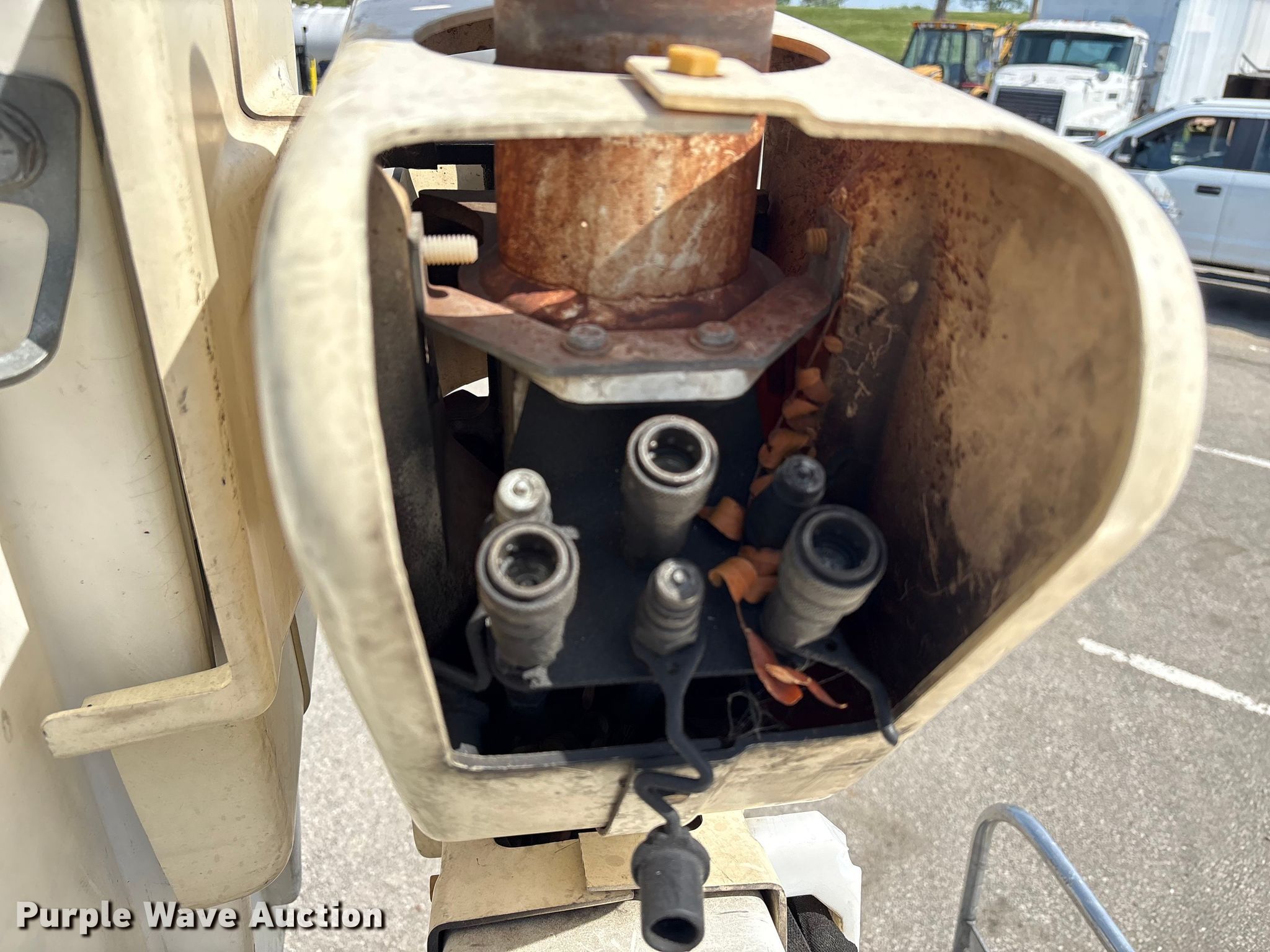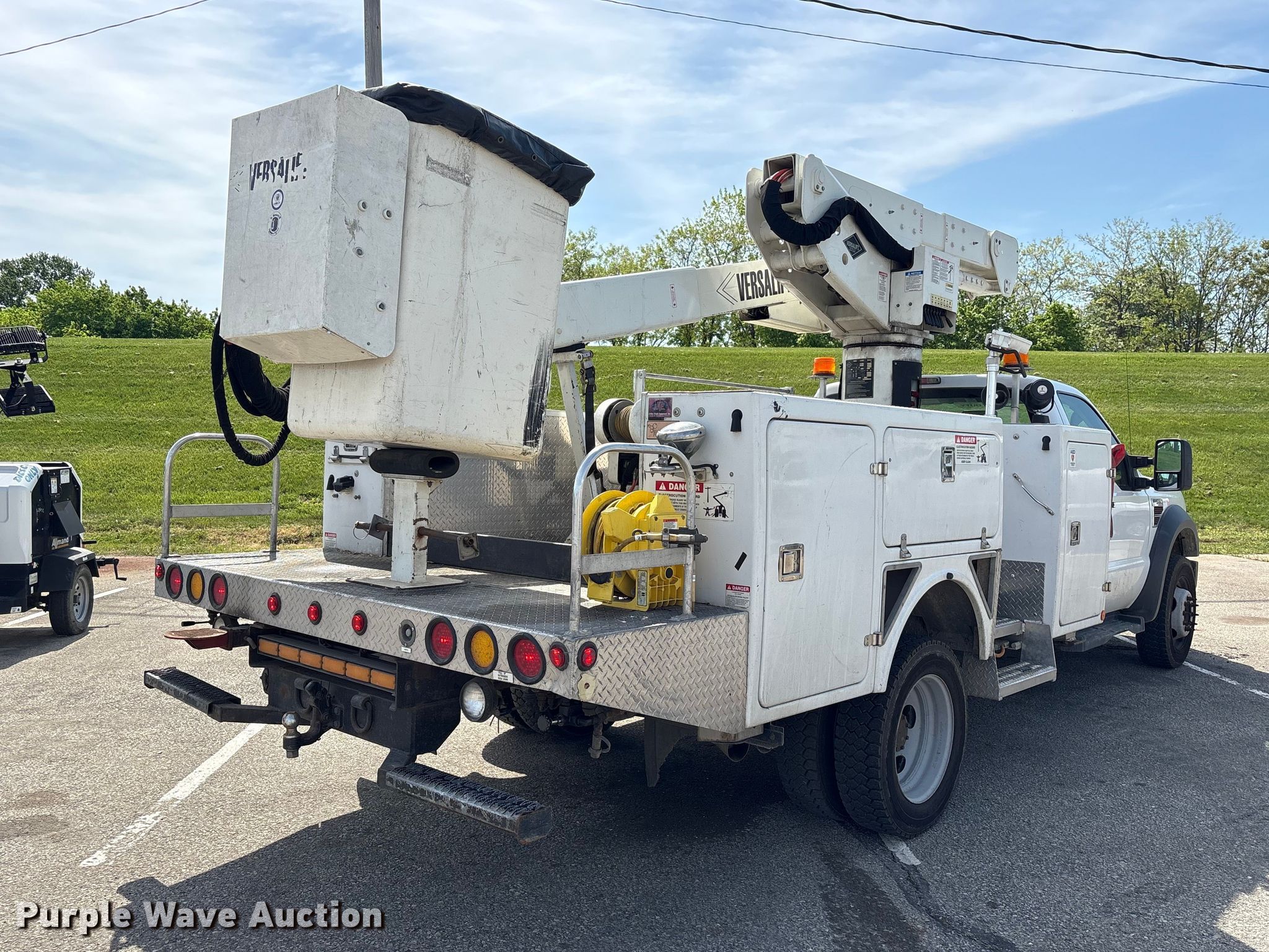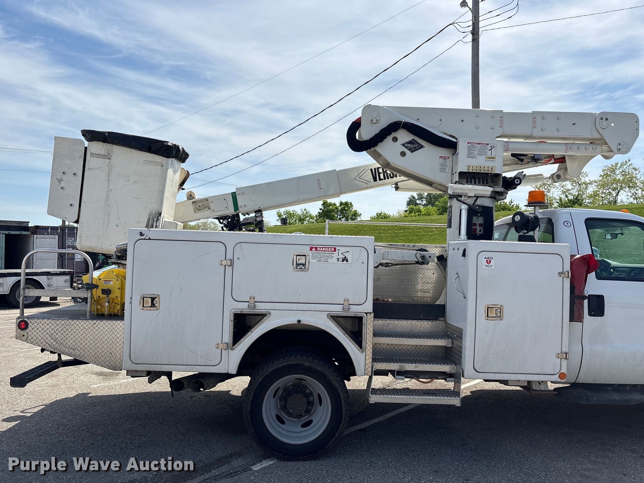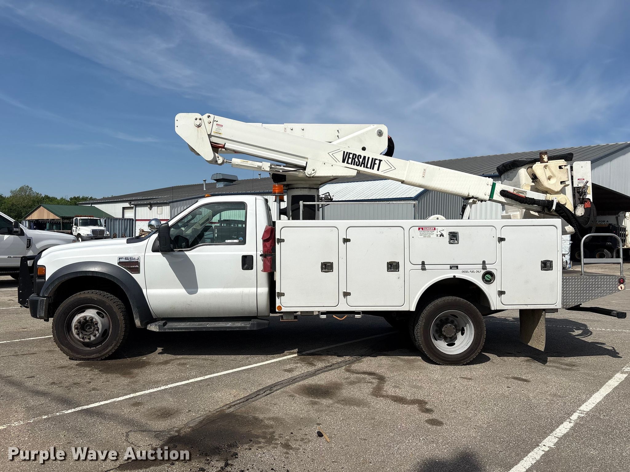 2010 Ford F550 Super Duty bucket truck. Miles: 53,559 on odometer, VIN: 1FDAF5HR1AEB01082. Engine Displacement: 6.4L, Cylinders: 8, Fuel type: Diesel. Transmission Automatic. Chassis Four wheel drive, Axles: Single, Suspension: Spring, Brakes: Hydraulic, PTO, GVWR: 19,500 lbs, Wheelbase: 165". Interior AC, Heat, Cruise control, Auxiliary controls. Features Bed Utility bed, BrandFX, Serial: 0925770, Length: 13' 6", Width: 7' 10", Height: 3' 4", Boom 2009 Versalift VST-40, Serial: KW090116, Mast height: 40', Maximum lift capacity: 400 lbs, Boom type: Articulating, Insulated, Telescopic, Man basket, Boom controls Lower, Basket, Winch Warn M15000. Tires Size: 225/75R19.5, Brand: Goodyear. Notes Possible AC issues, may need charged. Indiana title. Transfer of ownership documentation will be assigned and distributed by the seller. Title distribution may be delayed up to 30 days from verification of funds. City of Lawrenceburg. Lawrenceburg, IN 47025