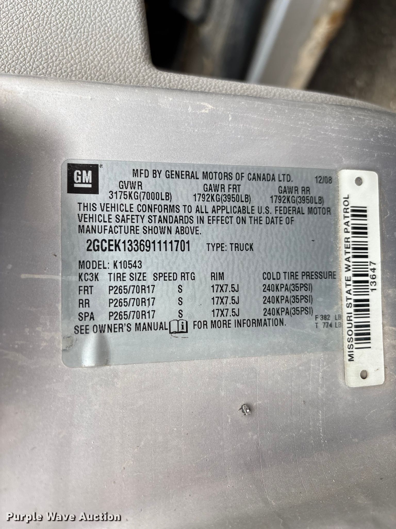 2009 Chevrolet Silverado 1500 Crew Cab pickup truck. Miles: 279,104 on odometer, VIN: 2GCEK133691111701. Engine Displacement: 5.3L, Cylinders: 8, Fuel type: Gas. Transmission Automatic, Four wheel drive. Interior AC, Heat, Power windows, Power locks, Cruise control. Tires Size: LT265/70R17. Notes Decals will be removed prior to auction, Non-operational transmission , Non-operational power windows, Dash warning indicator: ABS, Traction control, Airbag, Dash warning indicator: Service Stabilitrak, service airbag, service traction control, Windshield chipped or cracked, Jump start required during on-site data collection. Missouri title. Title distribution may be delayed up to 14 days from verification of funds. Dallas County Sheriff's Office. Buffalo, MO 65622