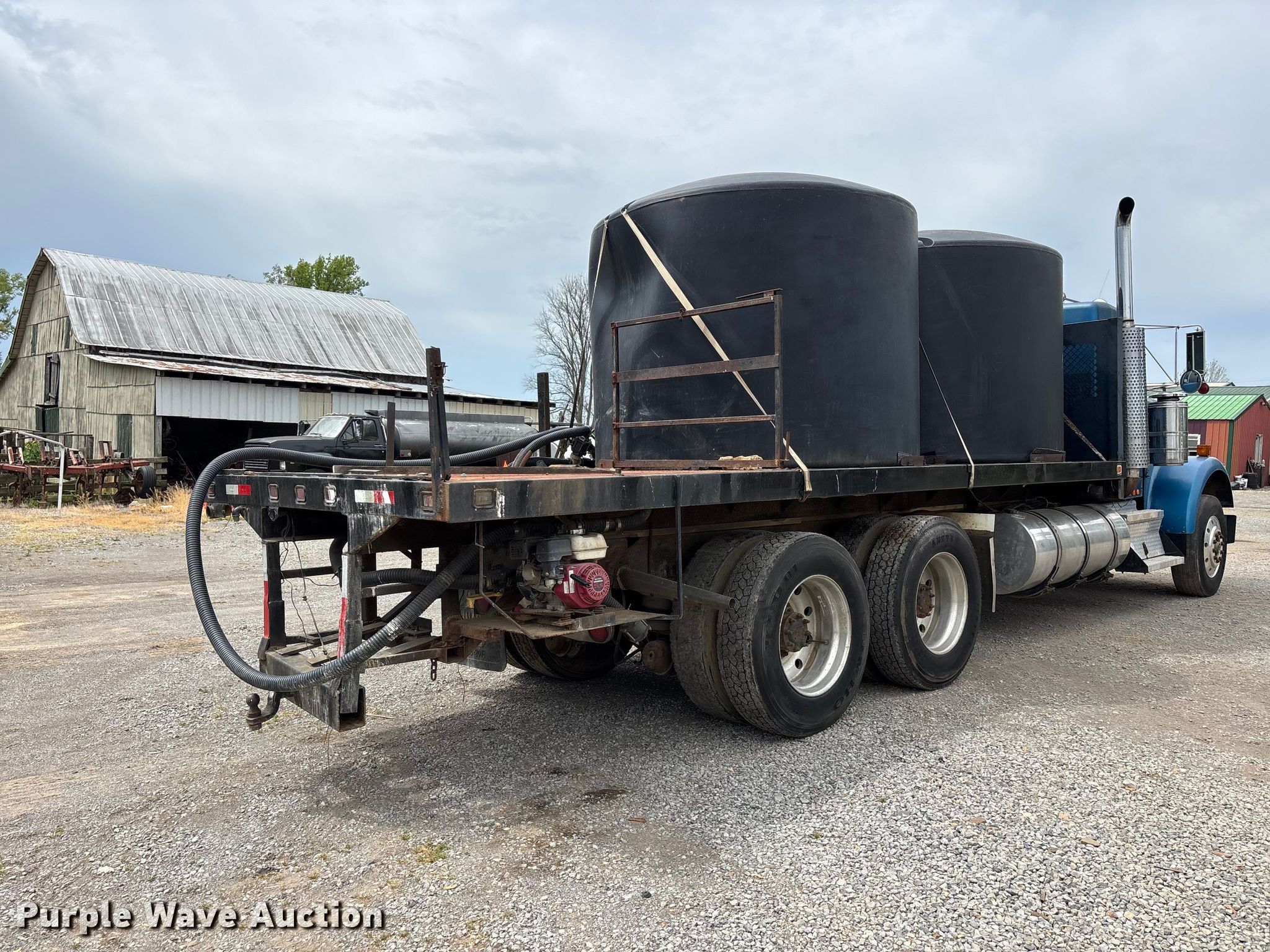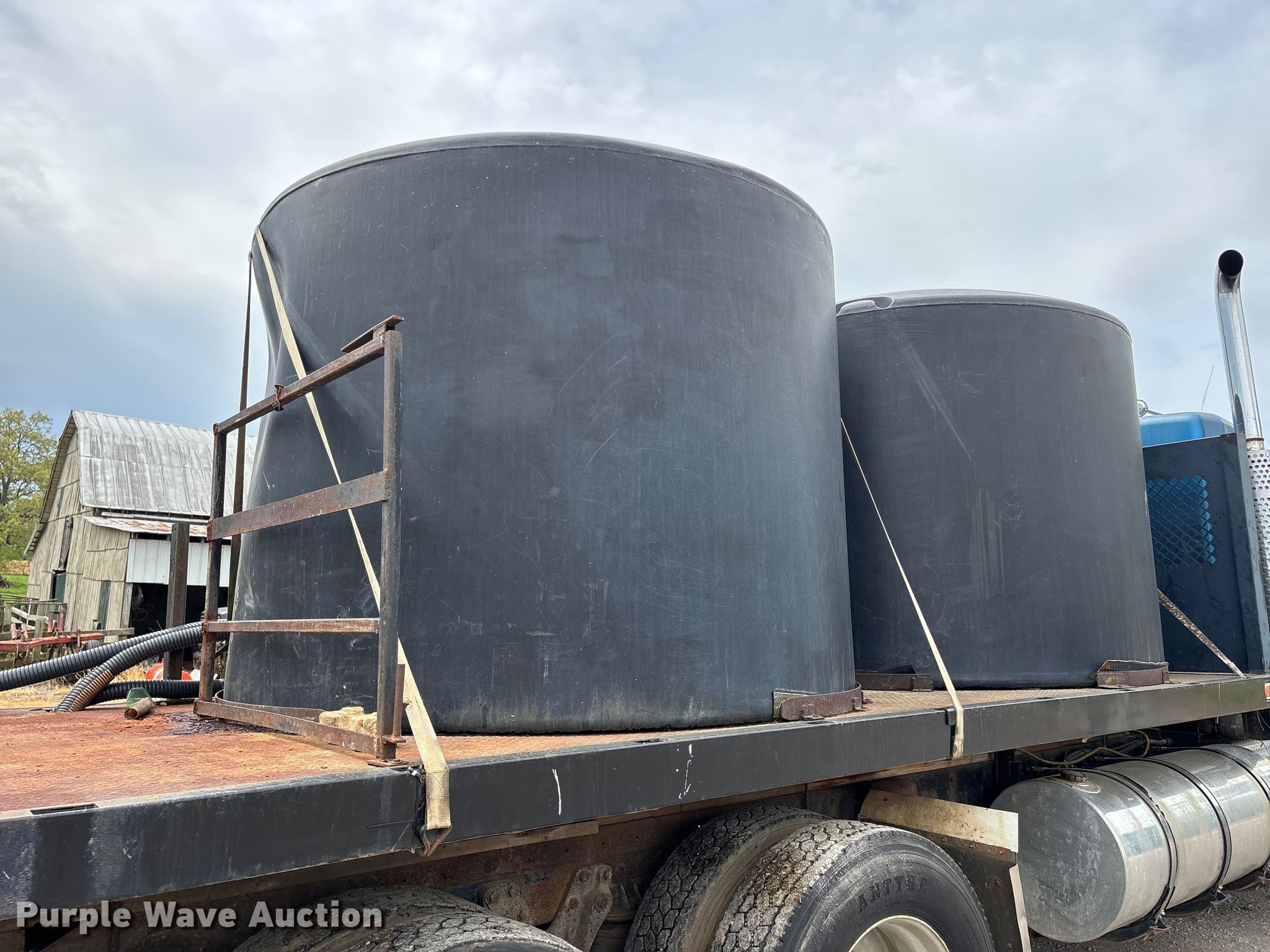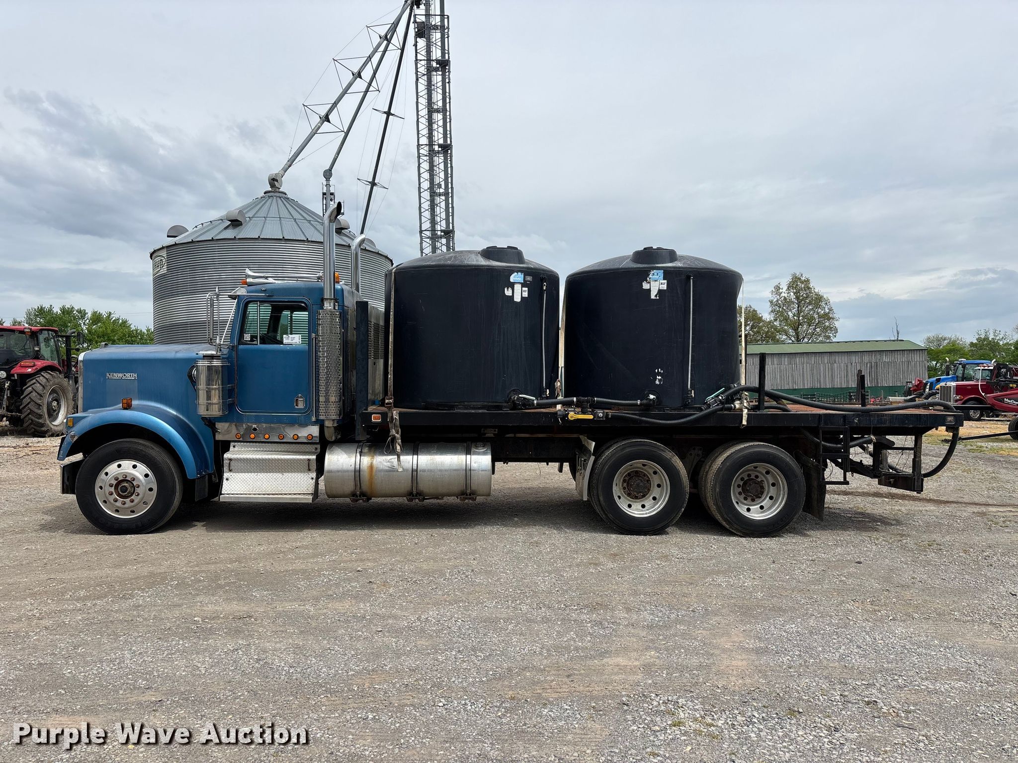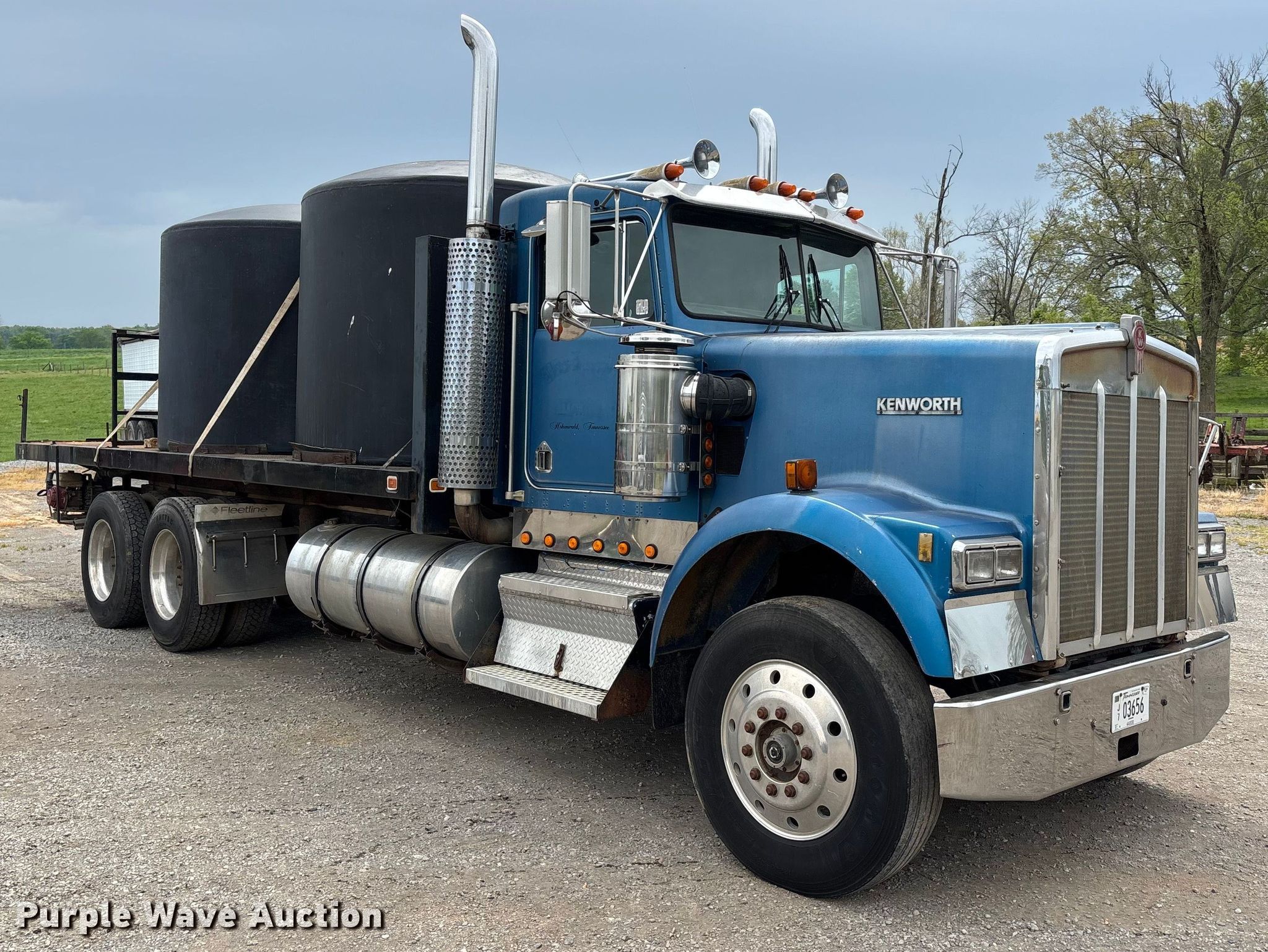 1988 Kenworth W90 flatbed truck. Miles: 27,108 on odometer, Miles: Actual unknown, VIN: 1XKWDB9X9JS514661. Engine Caterpillar 3406B, Displacement: 14.6L, Cylinders: 6, Fuel type: Diesel. Transmission Manual, Speed: 13. Chassis Axles: Tandem, Differential lock: Inter-axle, Suspension: Air, Brakes: Air. Interior Heat, Heated mirrors, Brake controller. Features Bed Flatbed, Length: 22' 4", Width: 7' 10", (2) poly tanks Capacity: 1500 gallons each, Sight tube, Inlet: 3", Outlet: 2", Honda GX 160 pump engine Cylinders: Single, Fuel type: Gas, Approx. 14' of fill hose. Tires Size: 11R24.5. Notes Windshield chipped or cracked, Jump start required during on-site data collection. Pursuant to Tennessee law, Purple Wave will not be collecting sales taxes on any of the purchases made in this business liquidation auction. Tennessee title. Mileage has not been verified. Exempt will be written in the odometer disclosure on the title. Title distribution may be delayed up to 14 days from verification of funds. Rolling Acre Farm. Orlinda, TN 37141