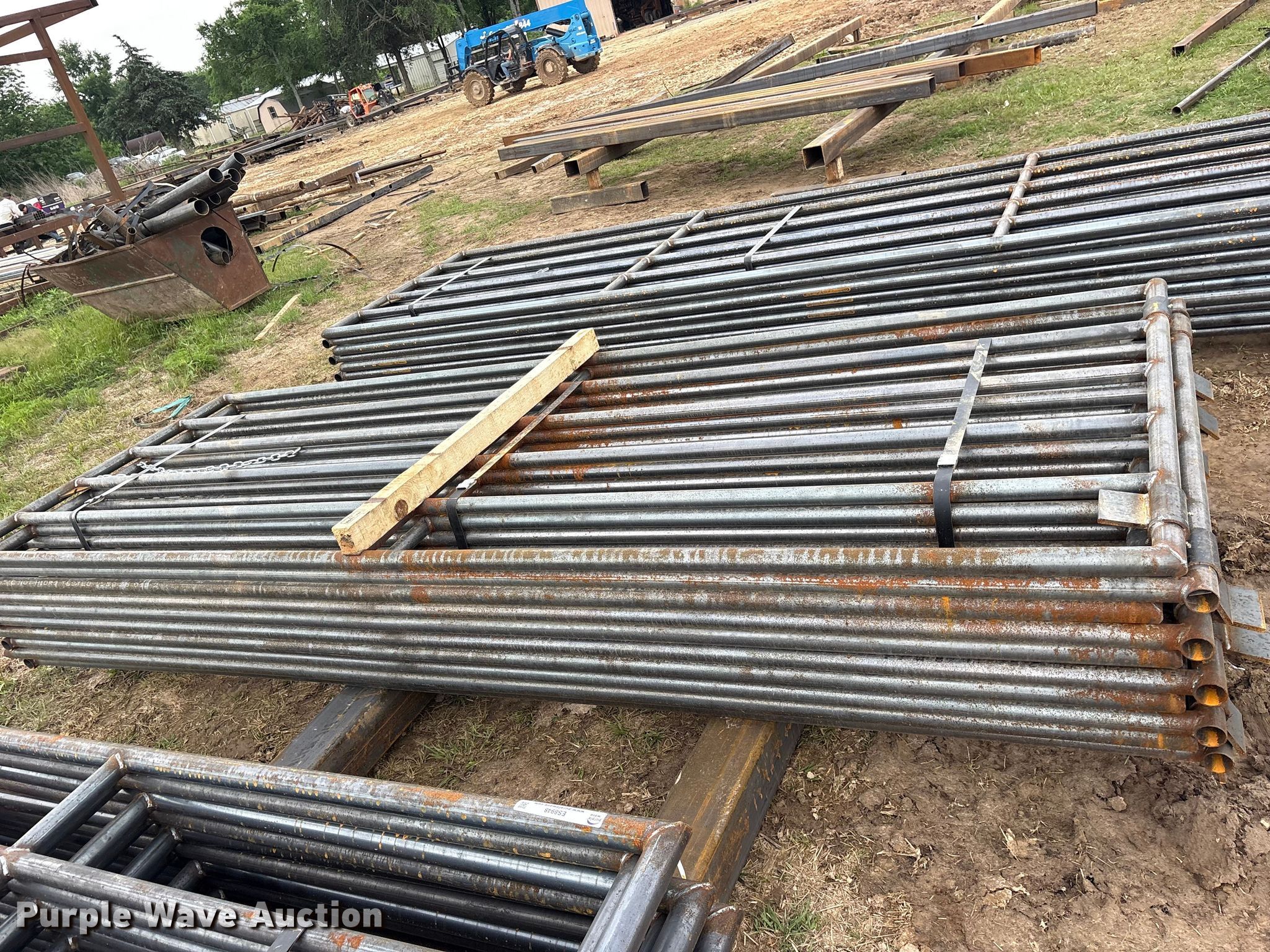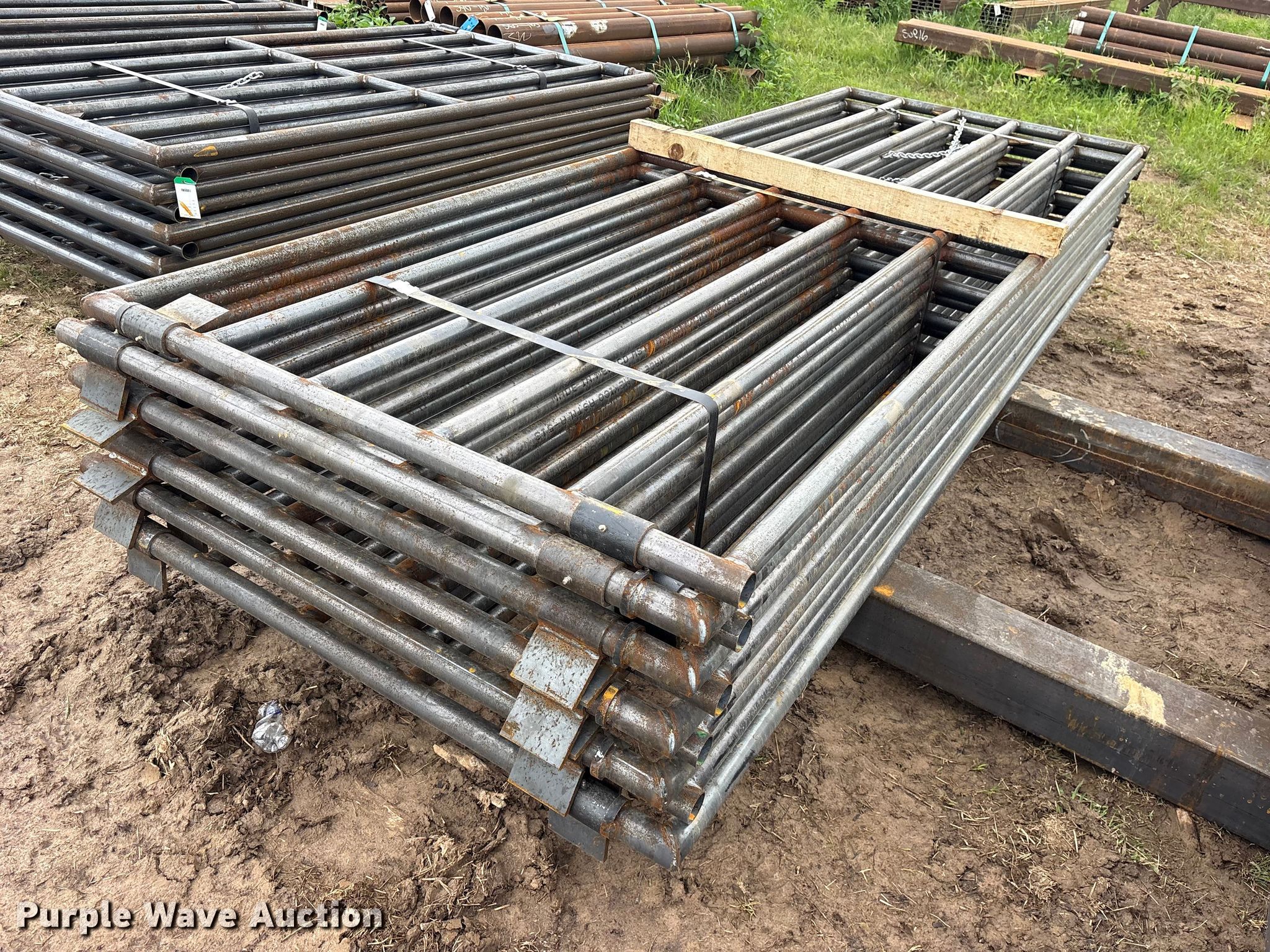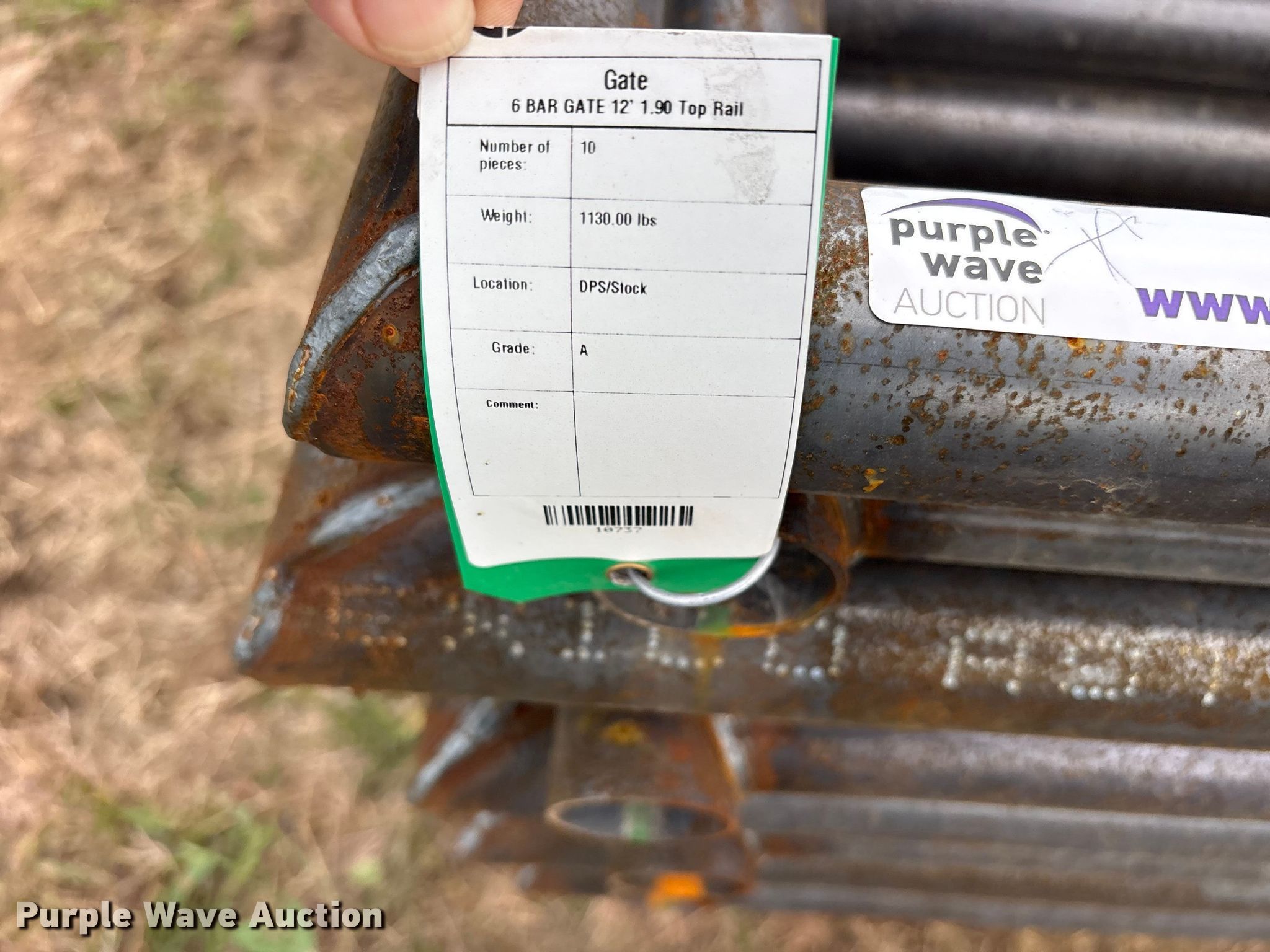 (10) 6 Bar livestock gates. Serial: 10737. Dimensions Overall Length: 12', Height: 4' 3". Discount Pipe & Steel. Pickton, TX 75471