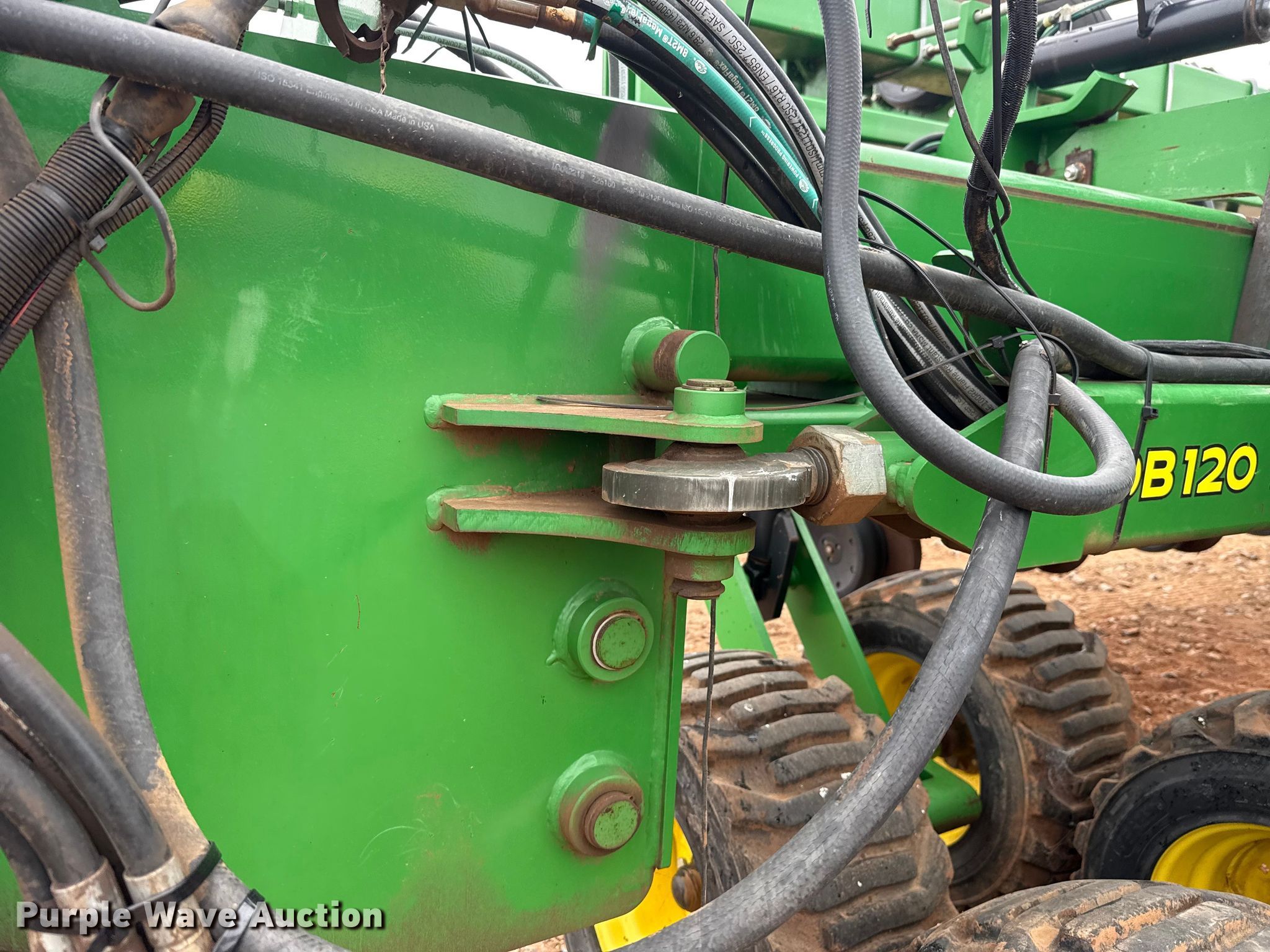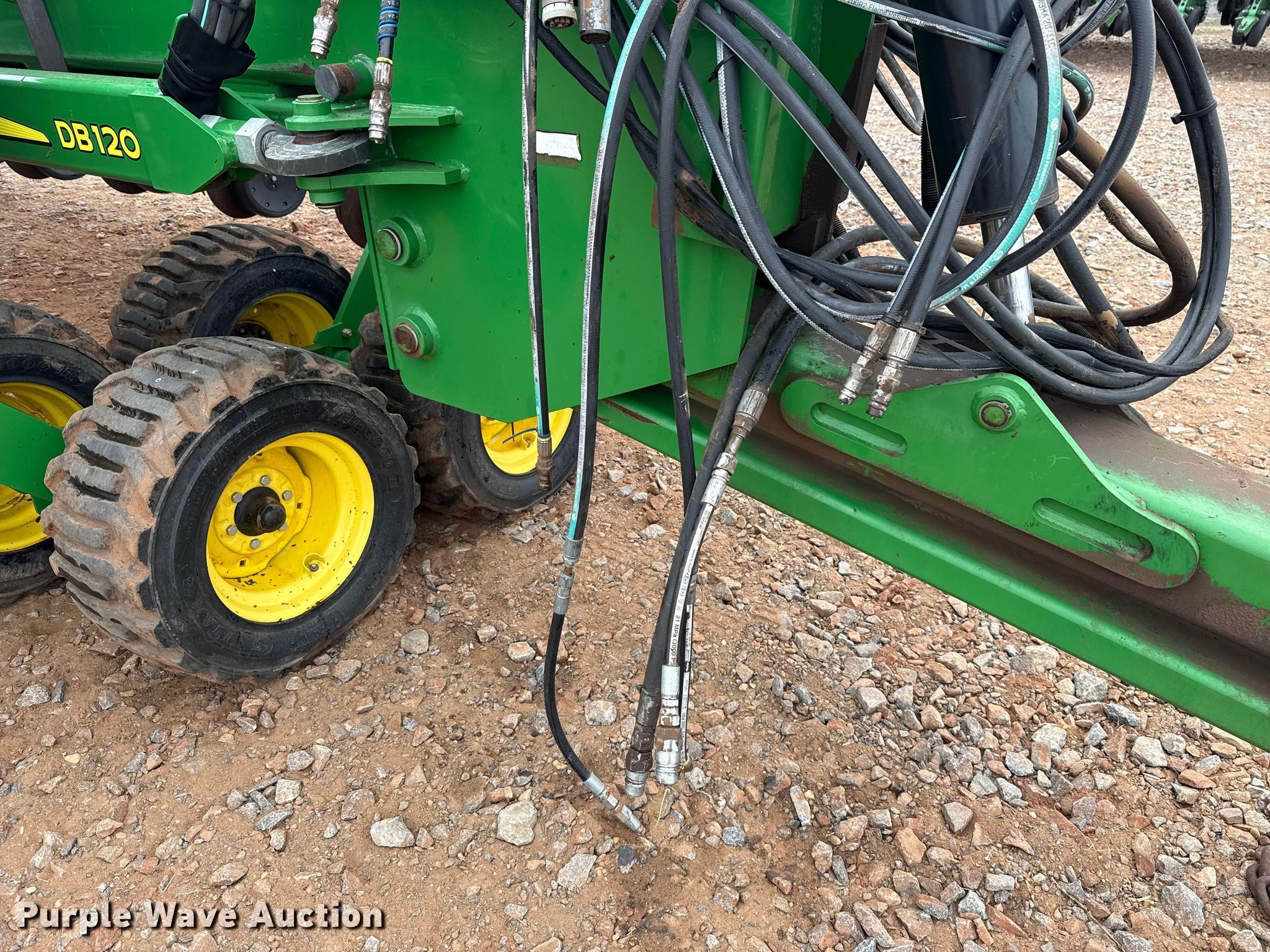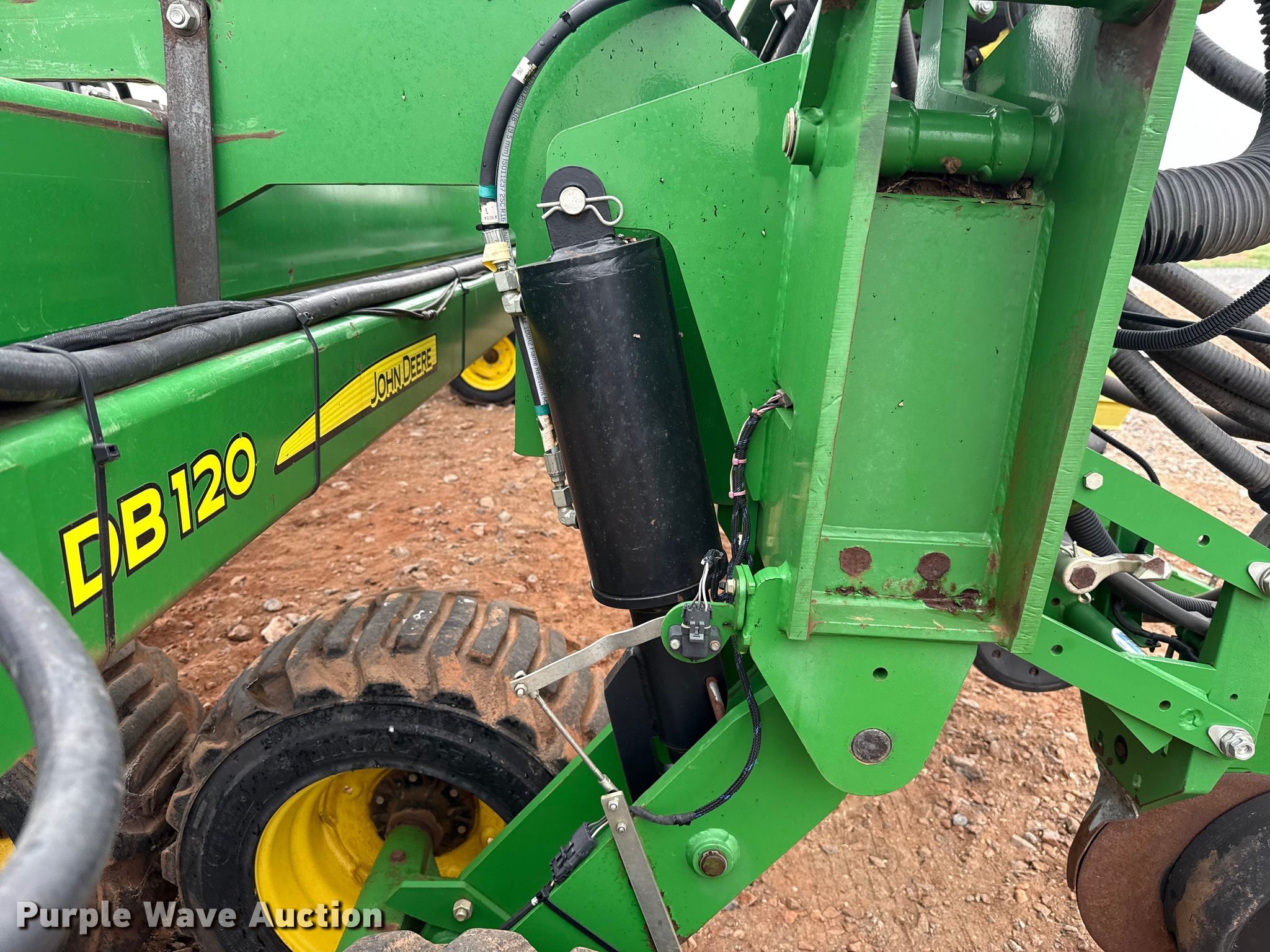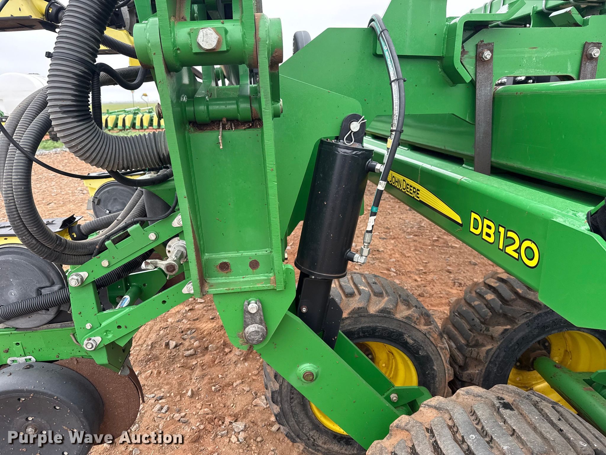 2015 John Deere DB120 planter. Acres: 17,043 on meter, Width: 120', Row units: 36, Row spacing: 40", Serial: 1JLDB12XAFM760105. Features Frame Fold type: Front, Seed delivery Bulk fill system, Row units Vacuum metering, Meter drive: Electric, Seed meters: Cotton, Down pressure: Pneumatic, Disk openers: Double, Gauge wheels: Double. Tires Transport tire size: 445/50R22.5 Quantity: 4, Drive/ outside tire size: 31X15.50-16.5 Quantity: 8, Drive/ outside tire size: 9.5L-15 Quantity: 2. Notes Monitor not included. Miller Family Farms, LLC. Headrick, OK 73549