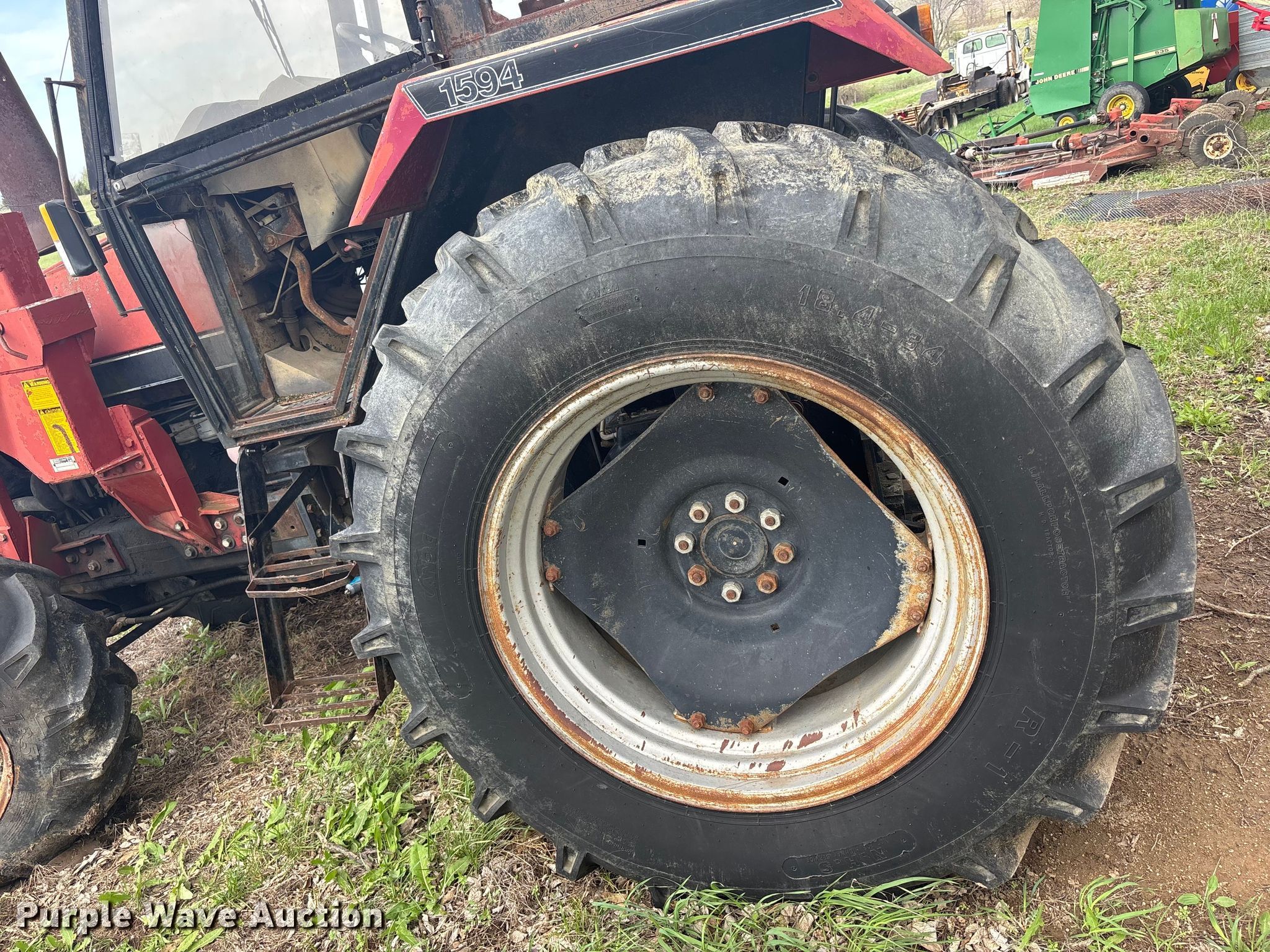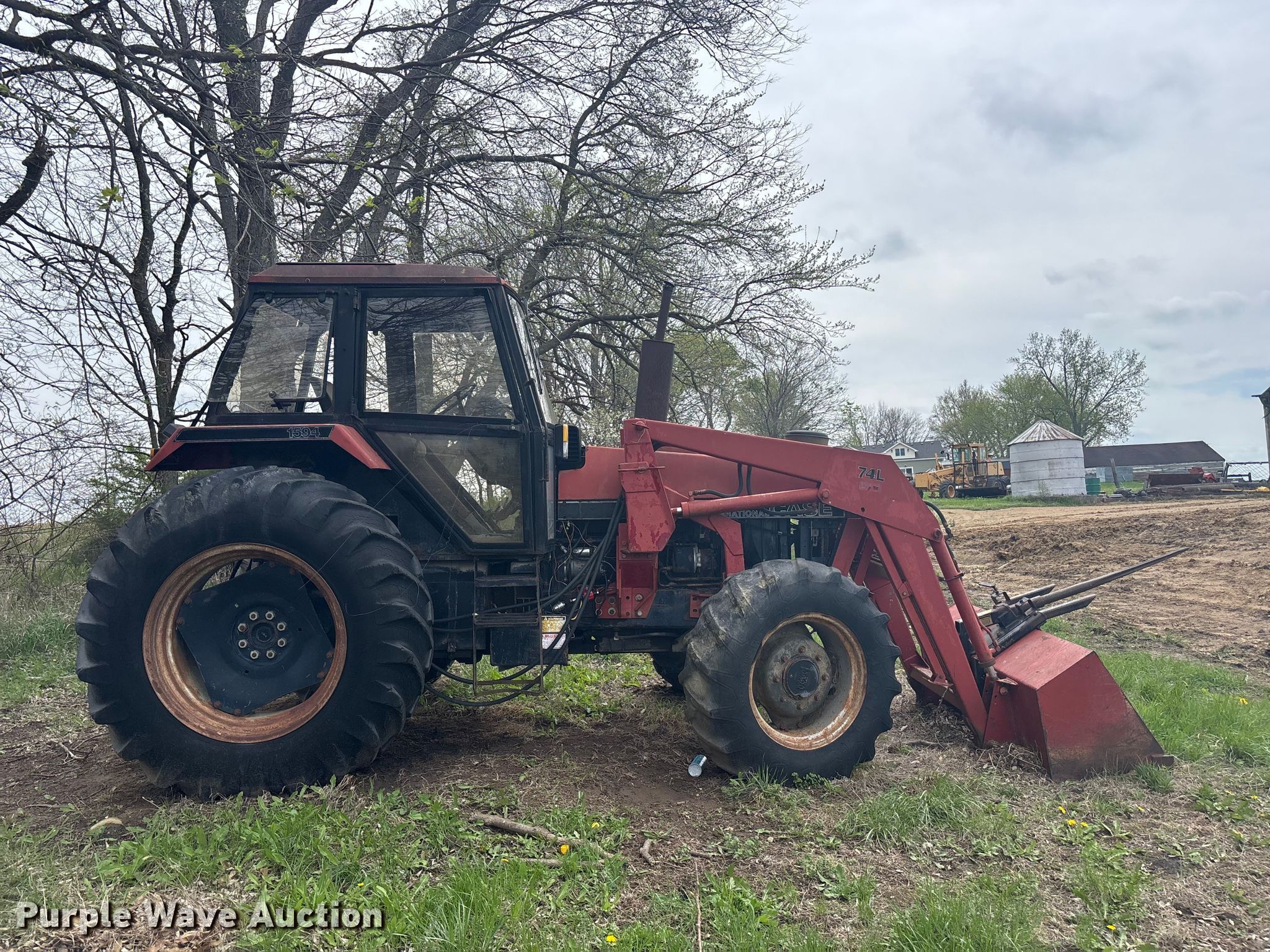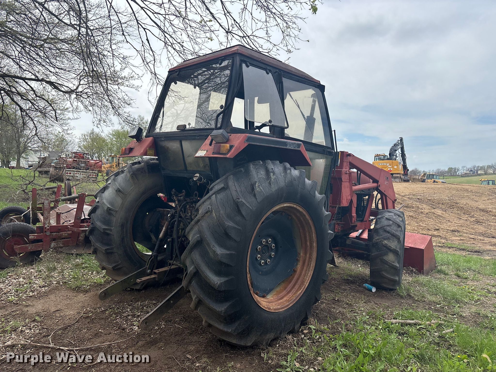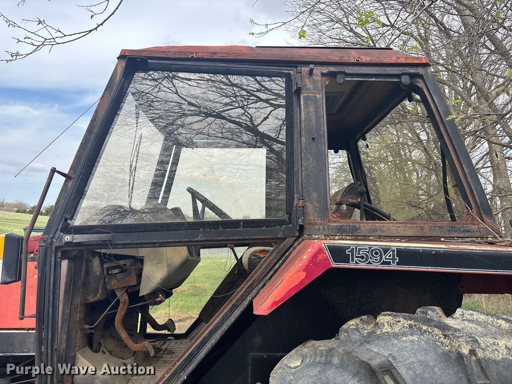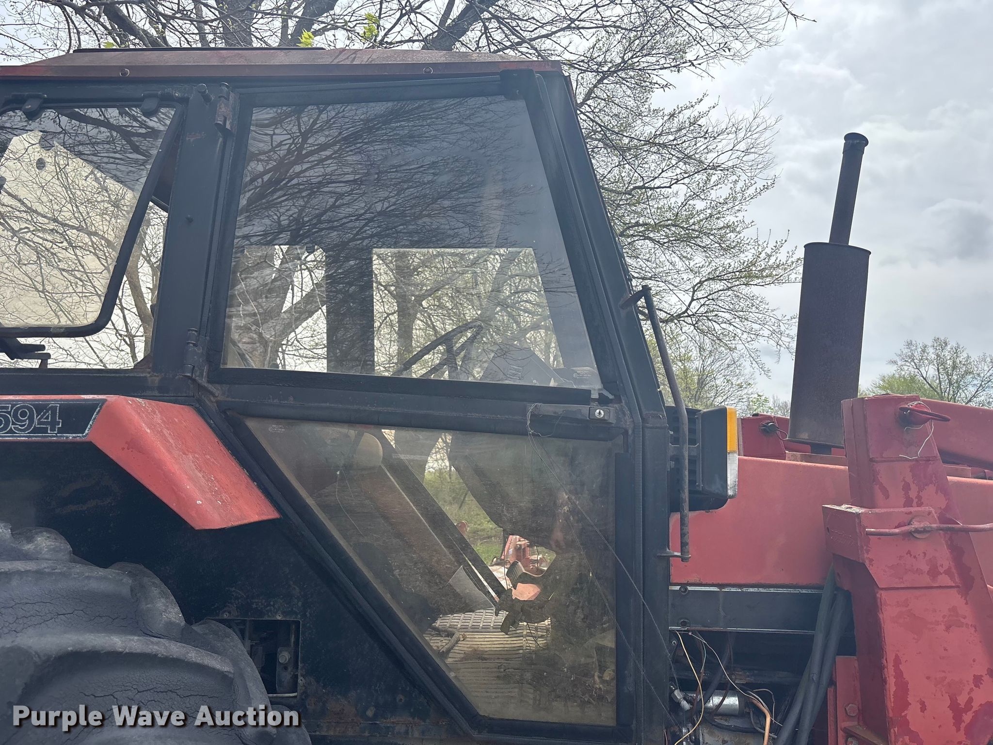 Case 1594 tractor. Engine. Cylinders: 6, Fuel type: Diesel. Transmission Manual, 12F - 3R, Differential lock. Operators station AC, Heat. Features PTO: 540, Seven pin outlet, Hydraulic remote sets Rear: 3, Loader Case 74L, Bale spear, Controls: Joystick, Bucket Width: 71".. Tires Front: 13.6-24, Rear: 18.4-34. Notes Glass cracked, Unknown operating condition. Hamilton, MO 64644