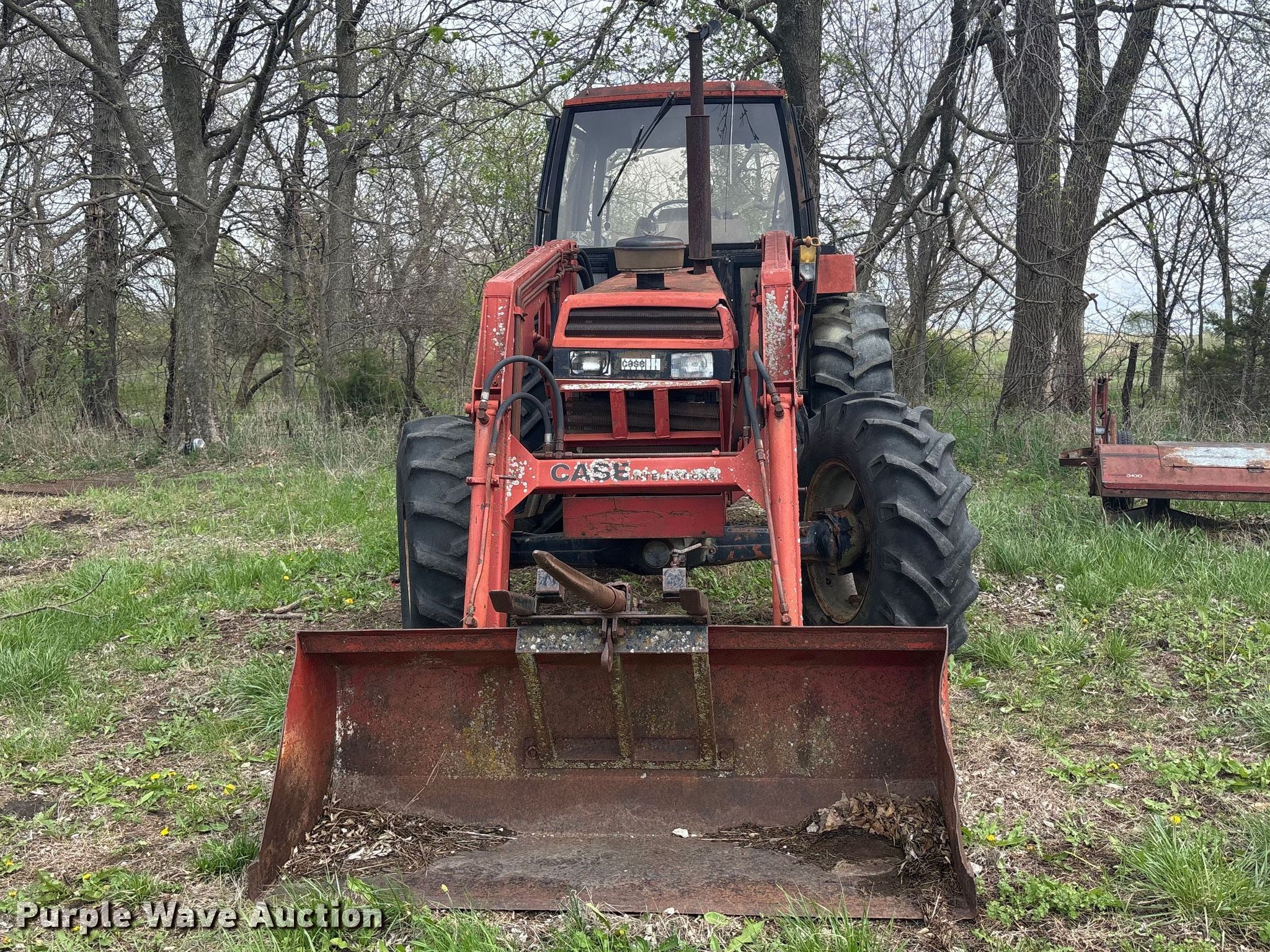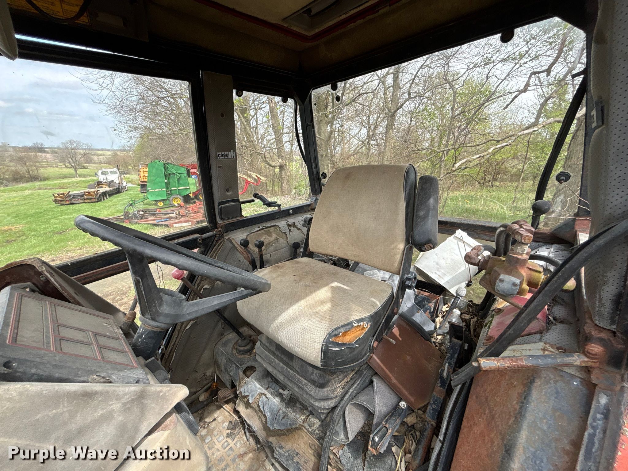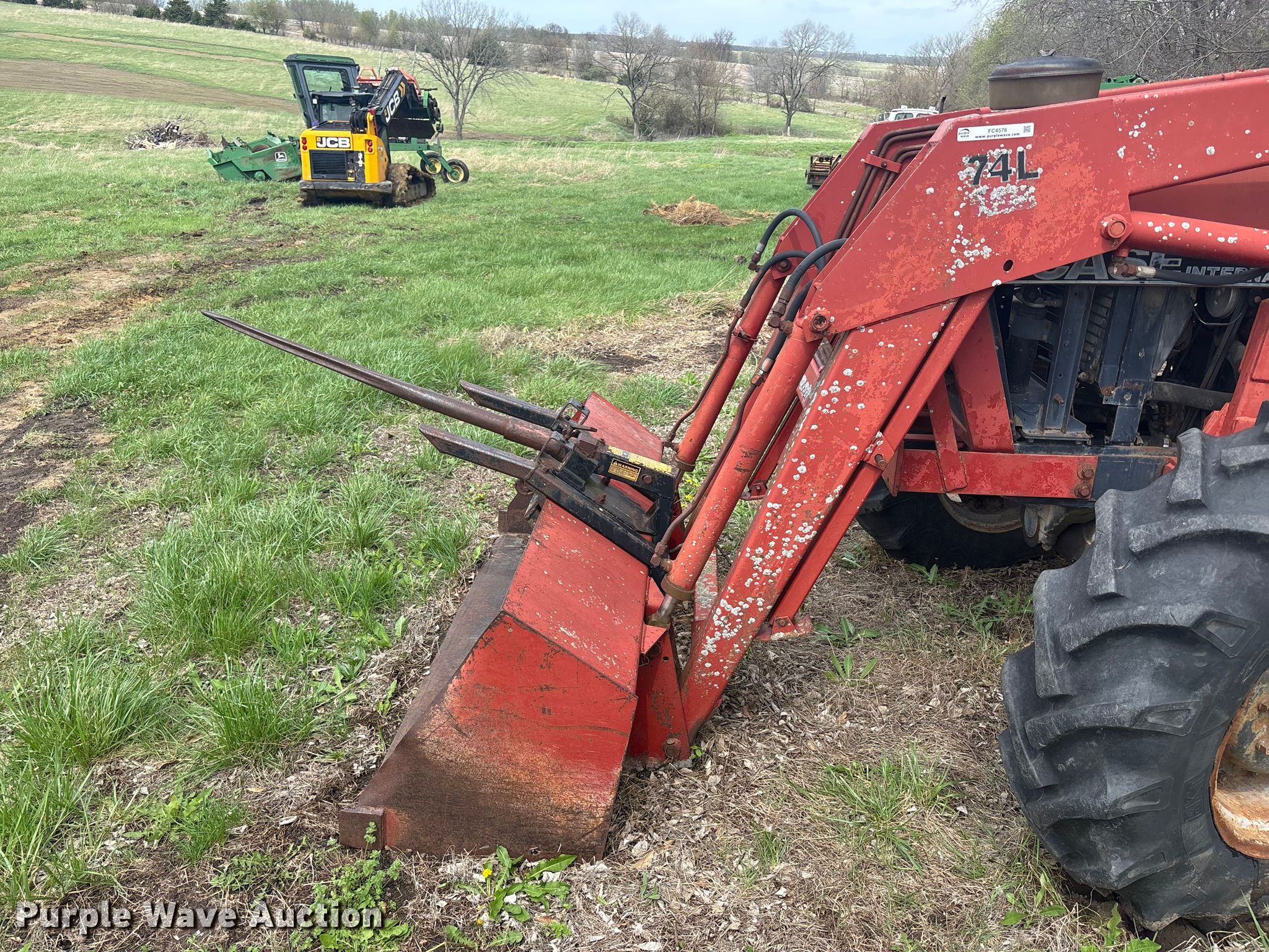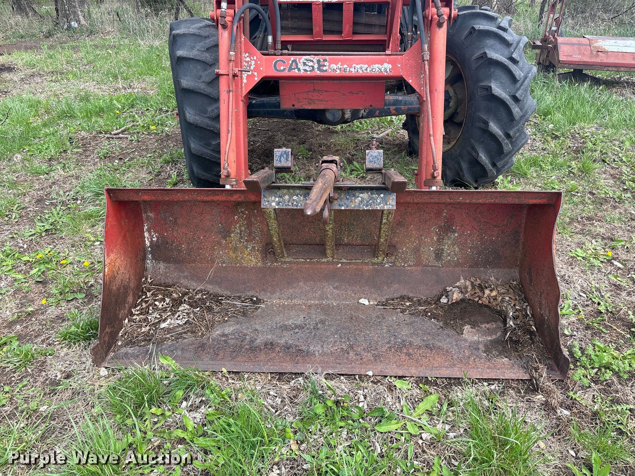 Case 1594 tractor. Engine. Cylinders: 6, Fuel type: Diesel. Transmission Manual, 12F - 3R, Differential lock. Operators station AC, Heat. Features PTO: 540, Seven pin outlet, Hydraulic remote sets Rear: 3, Loader Case 74L, Bale spear, Controls: Joystick, Bucket Width: 71".. Tires Front: 13.6-24, Rear: 18.4-34. Notes Glass cracked, Unknown operating condition. Hamilton, MO 64644