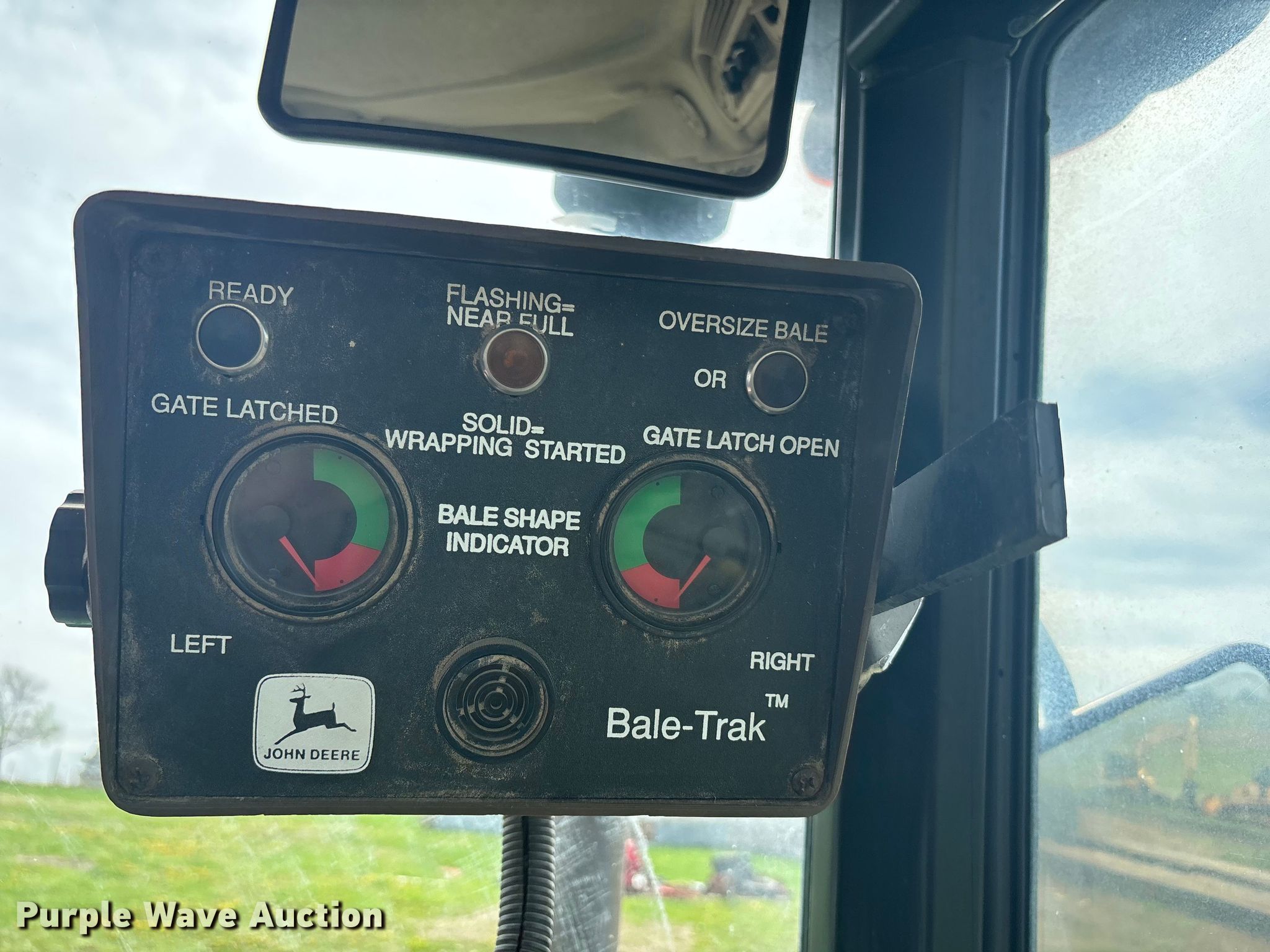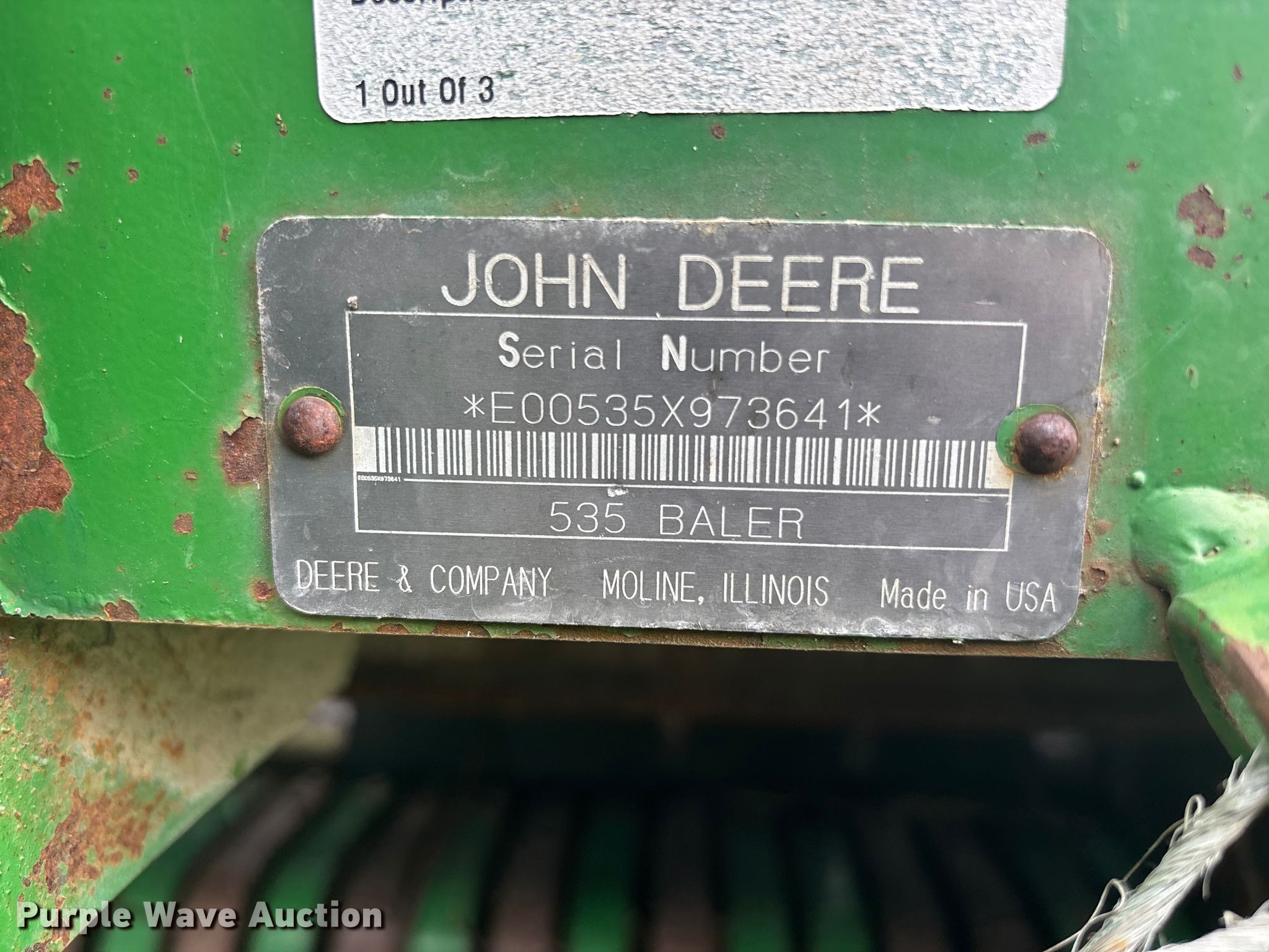 John Deere 535 round baler. Serial: E00535X973641. Features PTO: 540, Monitor John Deere Bale Trak, Transport lights, Gauge wheels, Pickup width: 60", Bale size: 5' x 5', Net-wrap. Tires Size: 13.50-15. Notes Unknown operating condition. Hamilton, MO 64644