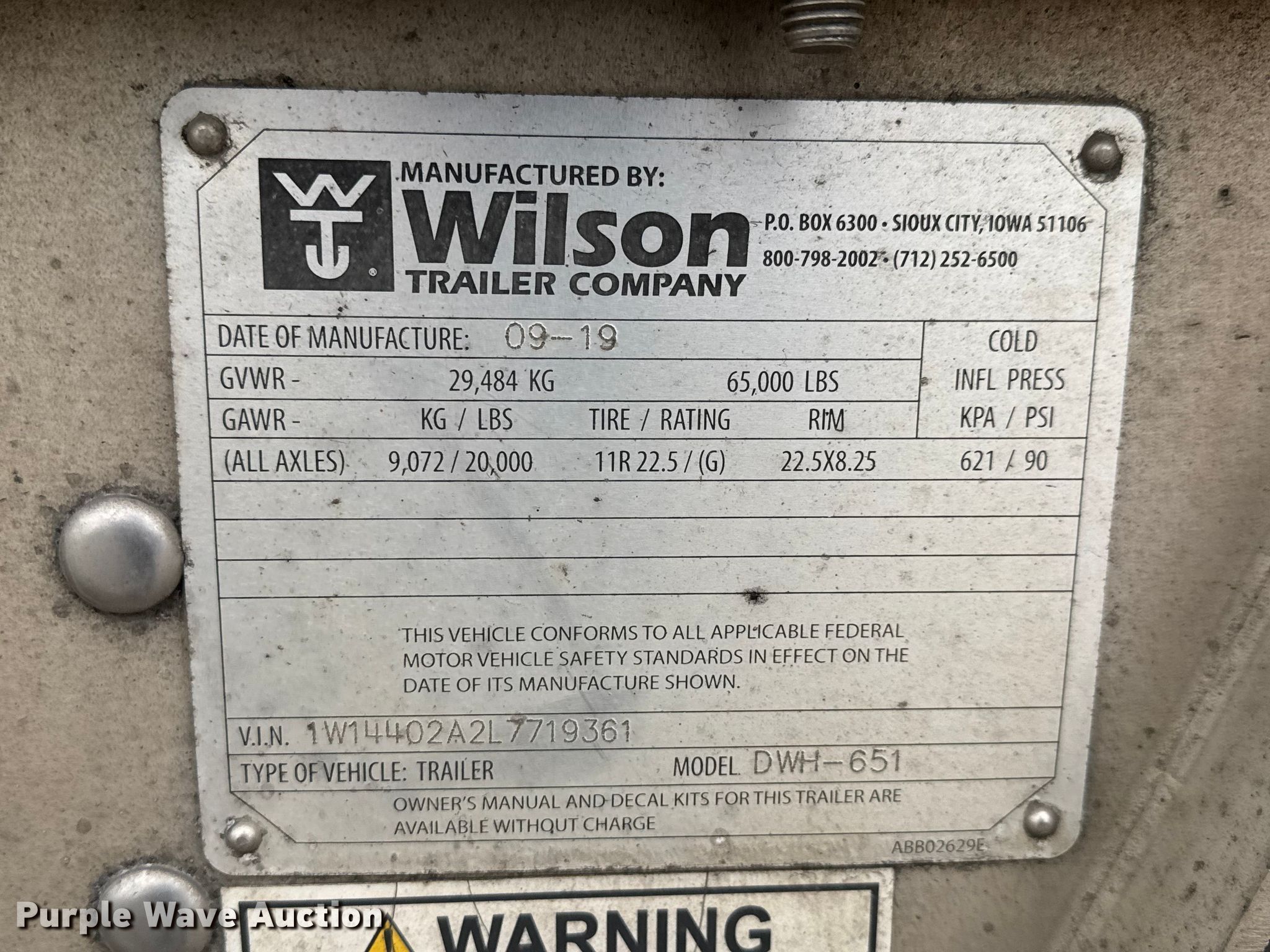 Purple Wave is selling a used Grain or Commodity Trailer in Kansas. This item is a 2020 Wilson DWH-651 grain trailer with the following: VIN: 1W14402A2L7719361