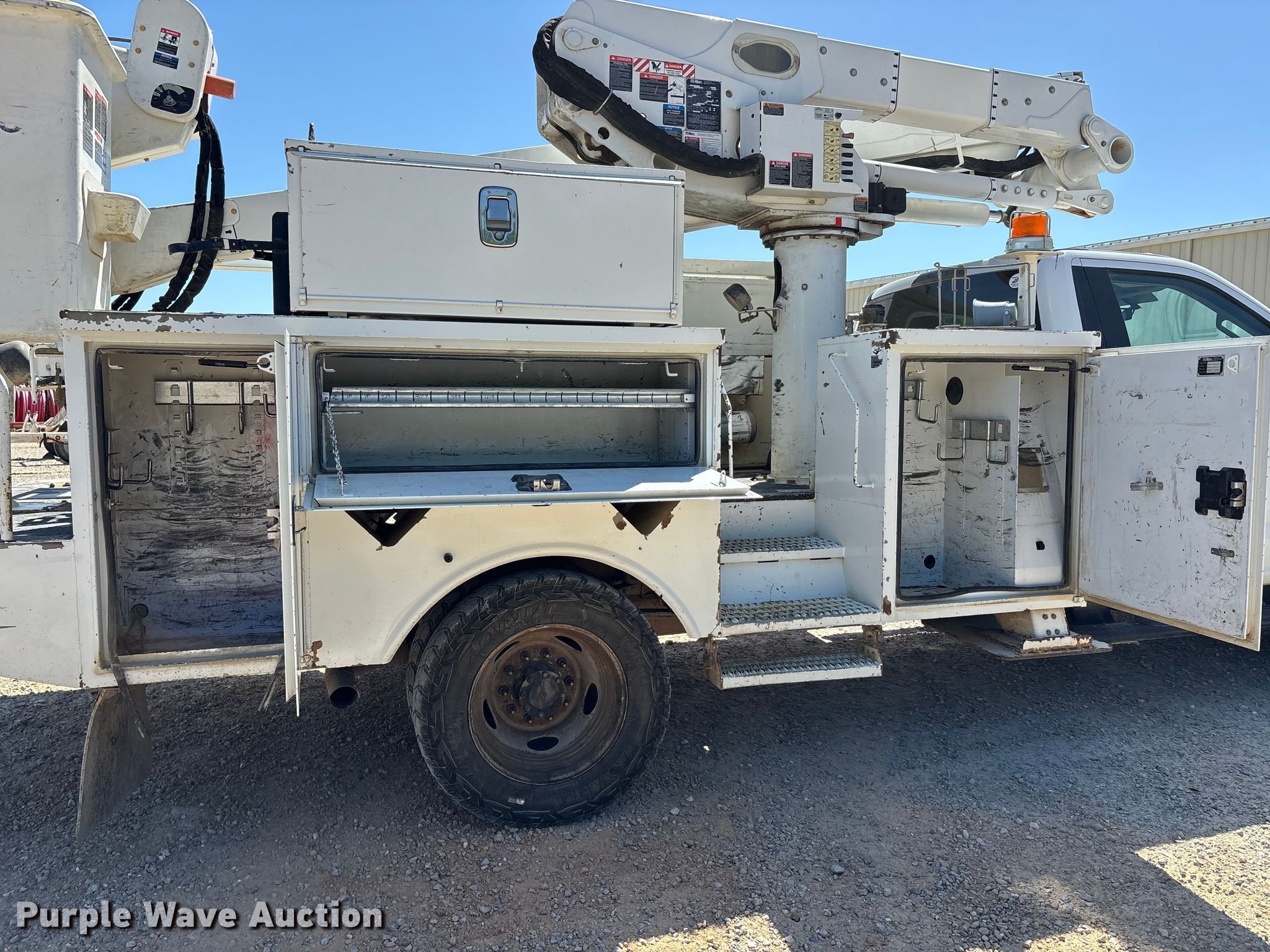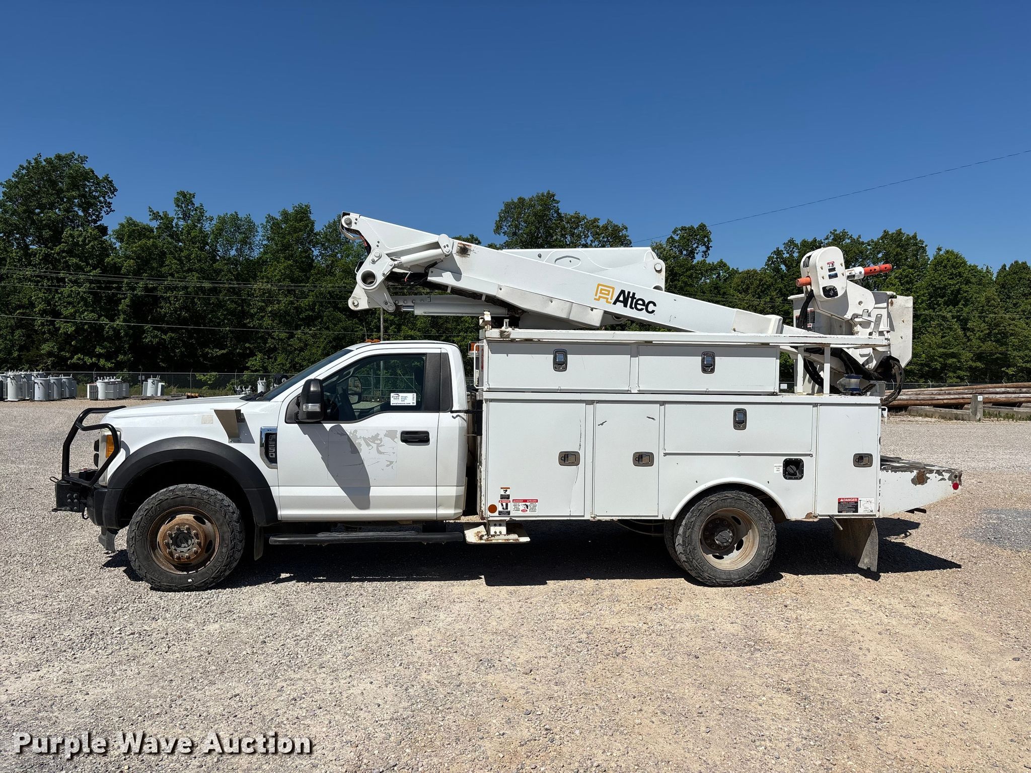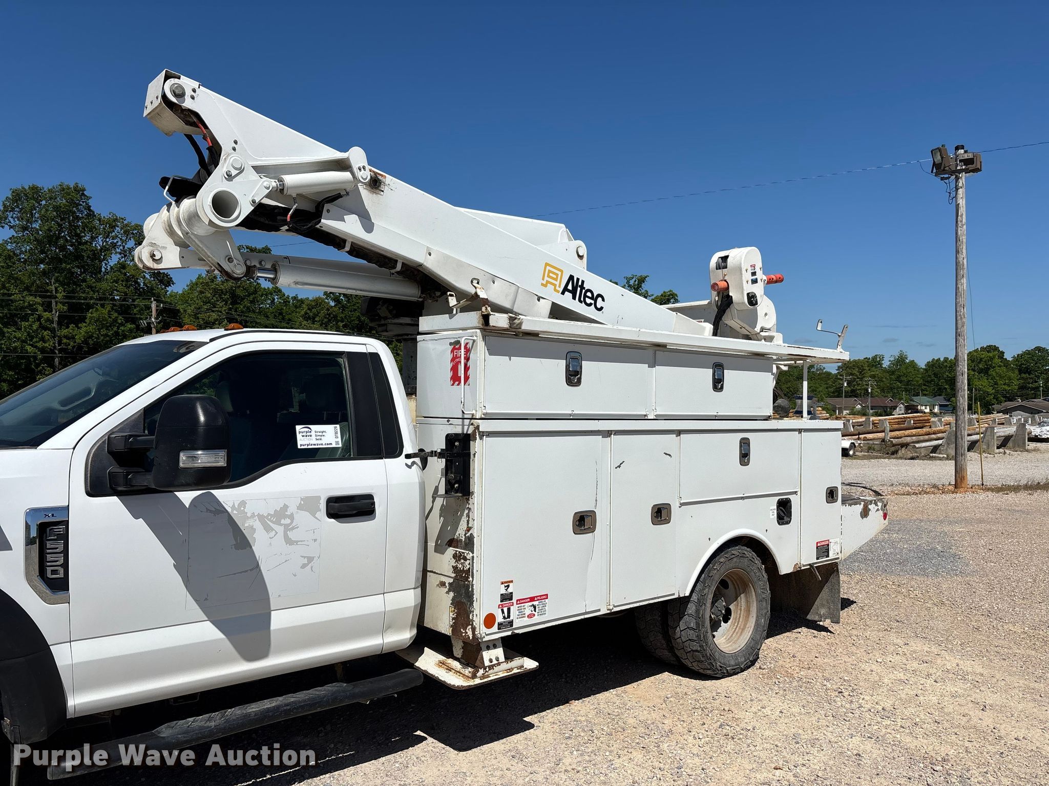 2017 Ford F550 bucket truck. Miles: 145,553 on odometer, VIN: 1FDUF5HY6HEC32183, Unit #: 22. Engine Displacement: 6.8L, Cylinders: 10, Fuel type: Gas. Transmission Automatic. Chassis Four wheel drive, Axles: Single, Suspension: Spring, Brakes: Hydraulic, PTO. Interior AC, Heat, Heated mirrors, Power windows, Power locks, Cruise control, Auxiliary controls. Features Bed Utility bed, Altec, Length: 11', Width: 7' 10", Height: 10' 4", Boom Altec AT41M, Maximum lift capacity: 400 lbs, Maximum lift height: 40', Boom type: Articulating, Insulated, Telescopic, Man basket, Boom controls Lower, Basket, Material handler. Tires Size: 245/70R19.5. Notes Dash warning indicator: Check engine, Dash warning indicator: Park brake light, Windshield chipped or cracked, Possible O2 sensor issue. Missouri title. Title distribution may be delayed up to 14 days from verification of funds. Ozark Border Electric Cooperative. Poplar Bluff, MO 63901