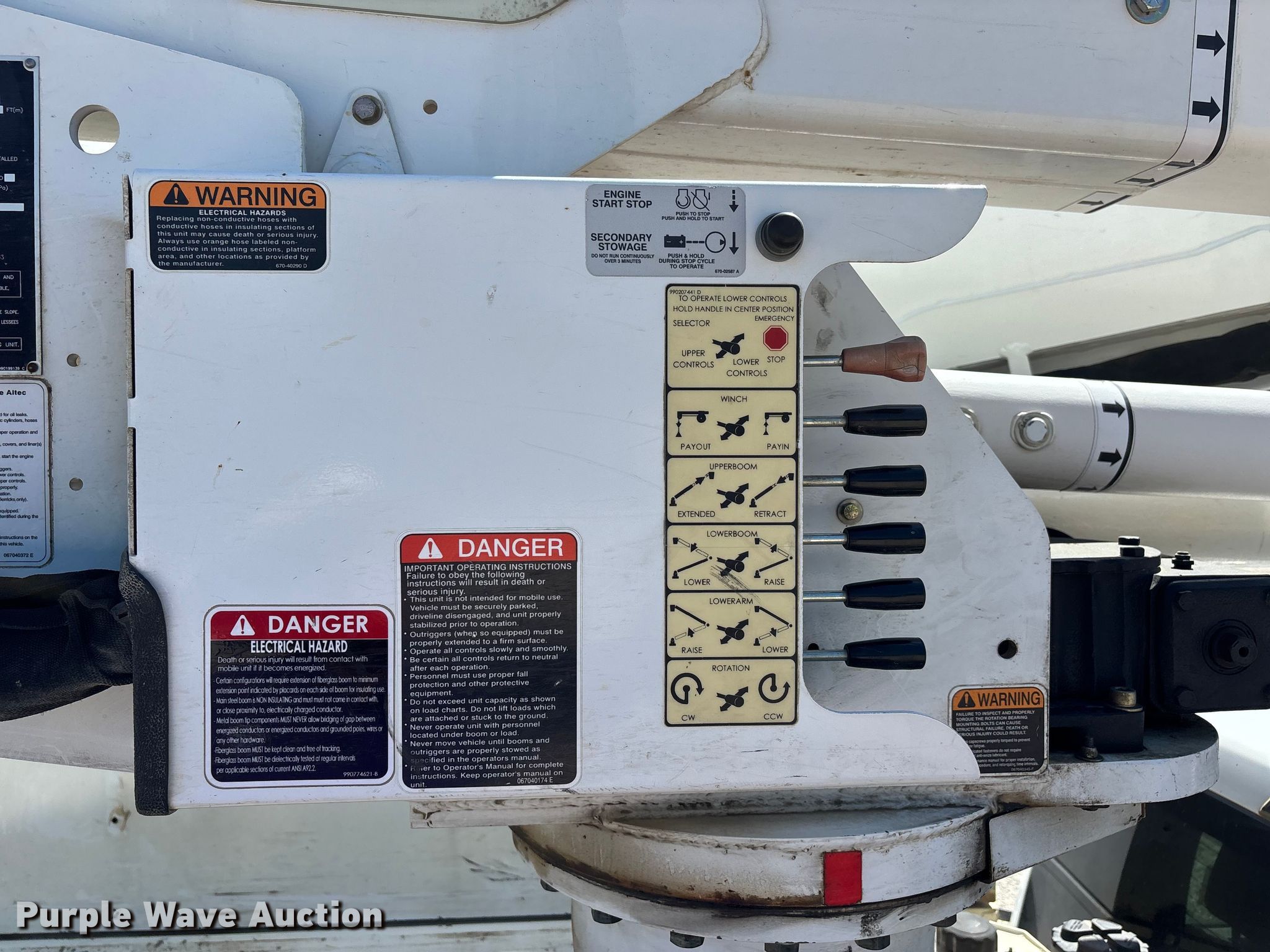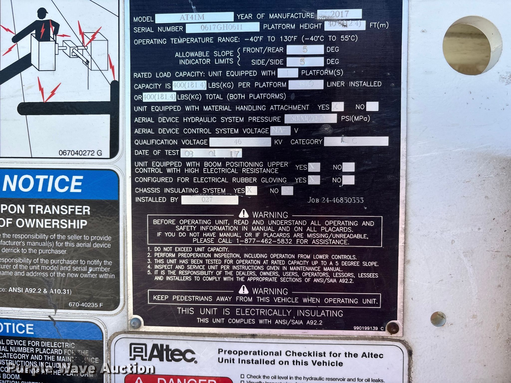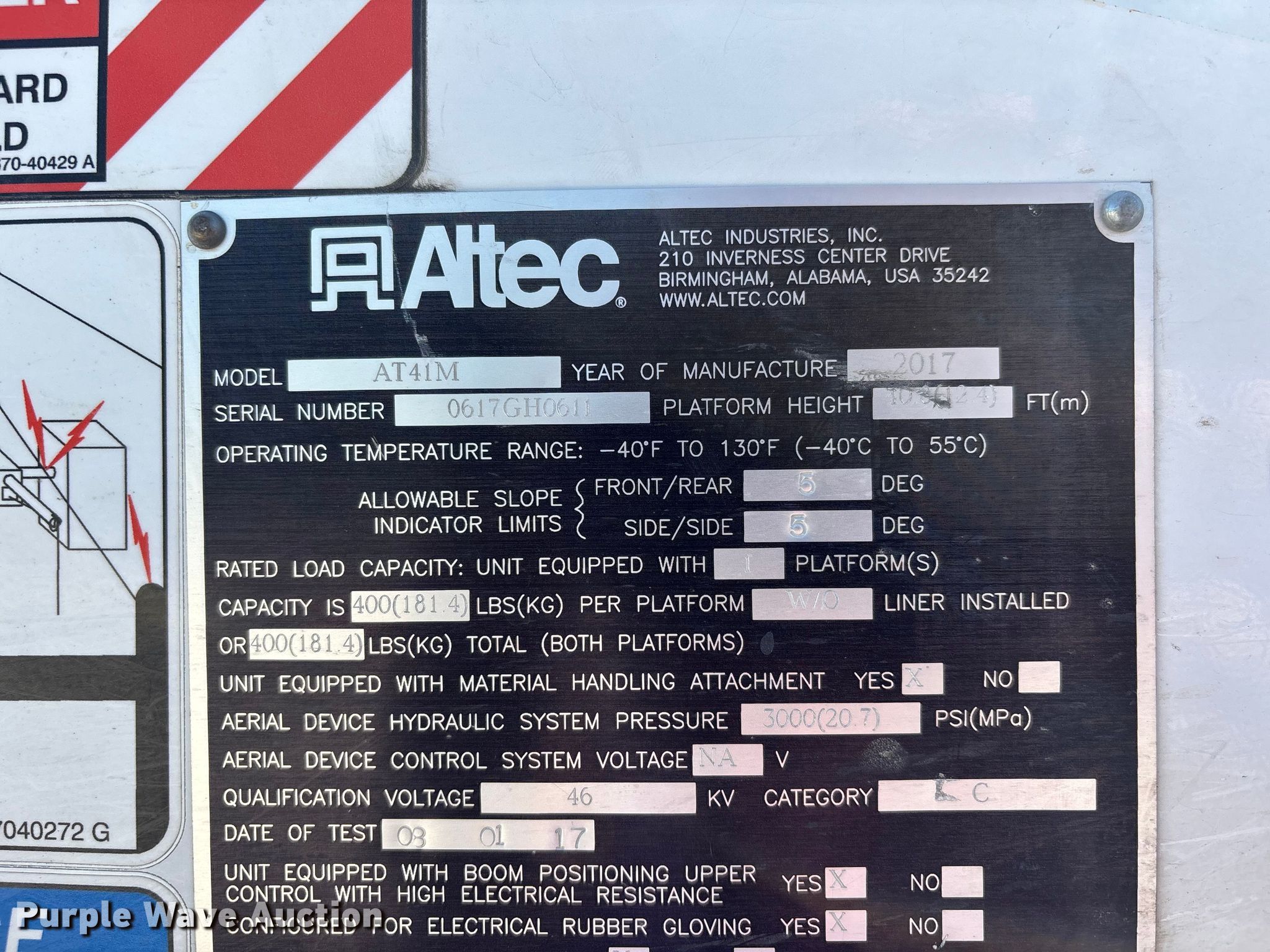 2017 Ford F550 bucket truck. Miles: 145,553 on odometer, VIN: 1FDUF5HY6HEC32183, Unit #: 22. Engine Displacement: 6.8L, Cylinders: 10, Fuel type: Gas. Transmission Automatic. Chassis Four wheel drive, Axles: Single, Suspension: Spring, Brakes: Hydraulic, PTO. Interior AC, Heat, Heated mirrors, Power windows, Power locks, Cruise control, Auxiliary controls. Features Bed Utility bed, Altec, Length: 11', Width: 7' 10", Height: 10' 4", Boom Altec AT41M, Maximum lift capacity: 400 lbs, Maximum lift height: 40', Boom type: Articulating, Insulated, Telescopic, Man basket, Boom controls Lower, Basket, Material handler. Tires Size: 245/70R19.5. Notes Dash warning indicator: Check engine, Dash warning indicator: Park brake light, Windshield chipped or cracked, Possible O2 sensor issue. Missouri title. Title distribution may be delayed up to 14 days from verification of funds. Ozark Border Electric Cooperative. Poplar Bluff, MO 63901