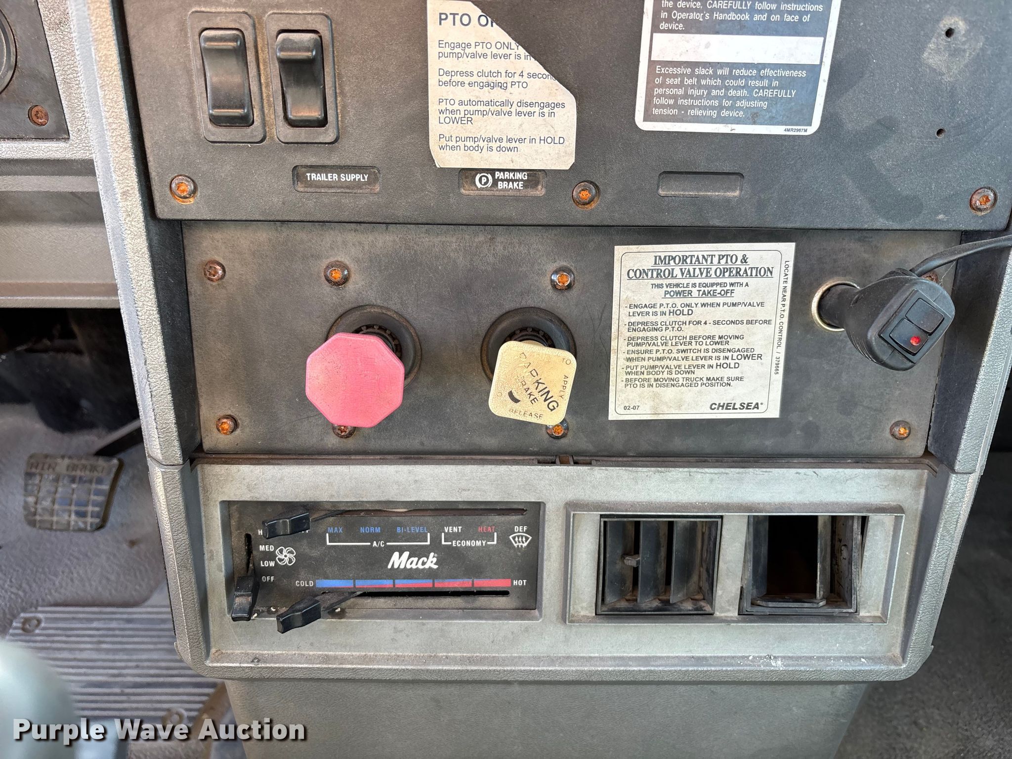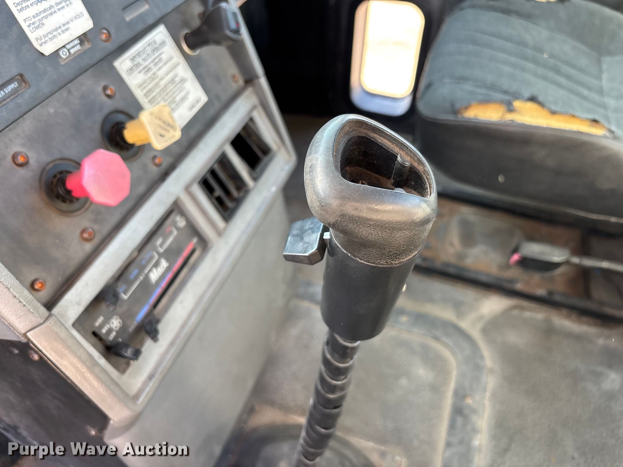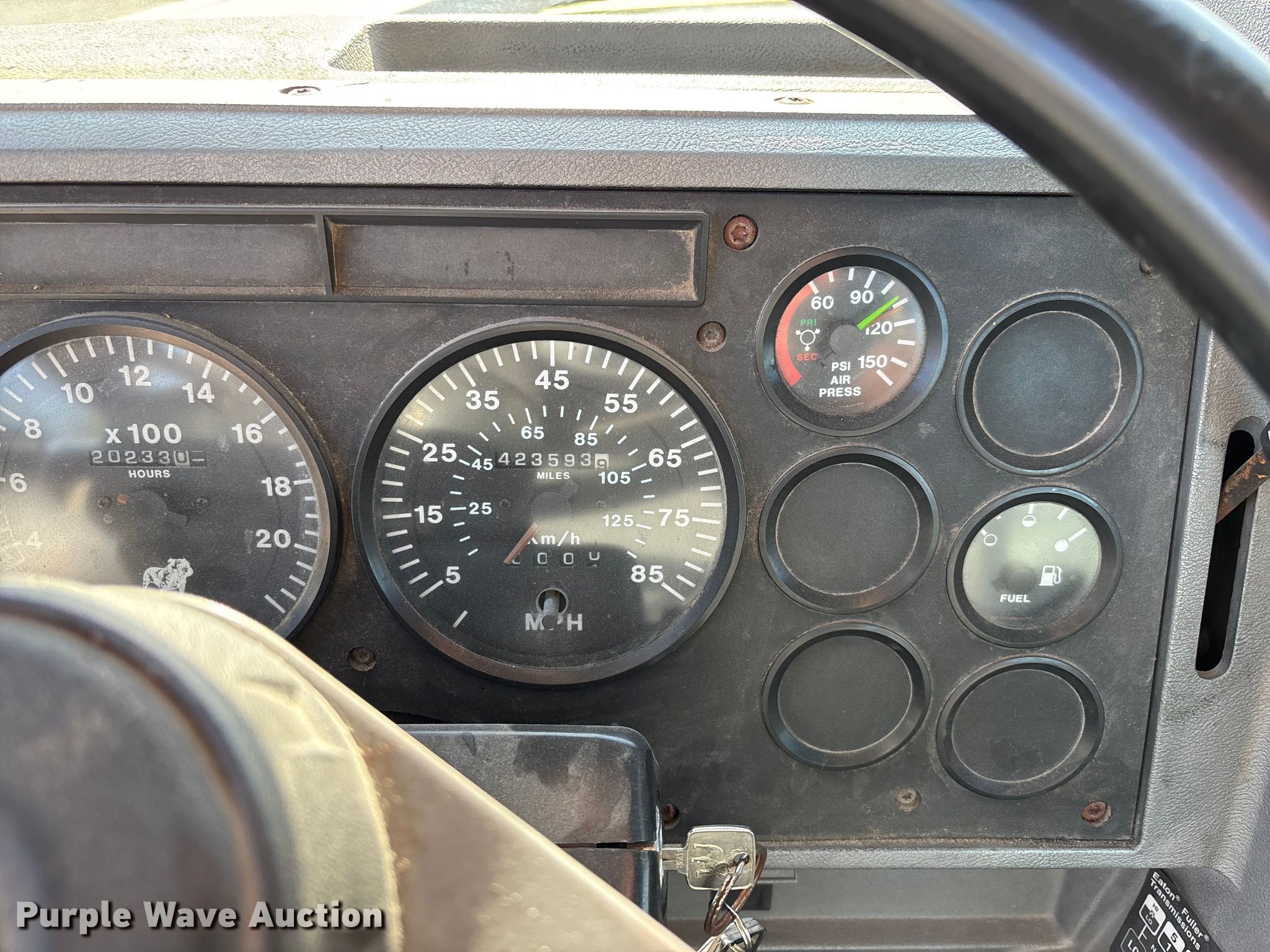 2000 Mack CH613 semi truck. Miles: 423,594 on odometer, Hours: 20,233 on meter, VIN: 1M1AA13Y6YW124453. Engine ReMack, Cylinders: 6, Fuel type: Diesel. Transmission Eaton fuller, Manual, Speed: 9. Chassis Four wheel drive, Axles: Tandem, Suspension: Camelback, Brakes: Air, PTO, Wet kit, GVWR: 50,000 lbs. Interior AC, Heat, Heated mirrors. Features Fifth wheel type: Air operated, Sliding, Fuel tank: Dual. Tires Size: 11R22.5. Florida title. Title distribution may be delayed up to 14 days from verification of funds. MasterRock, LLC.. Sarasota, FL 34234