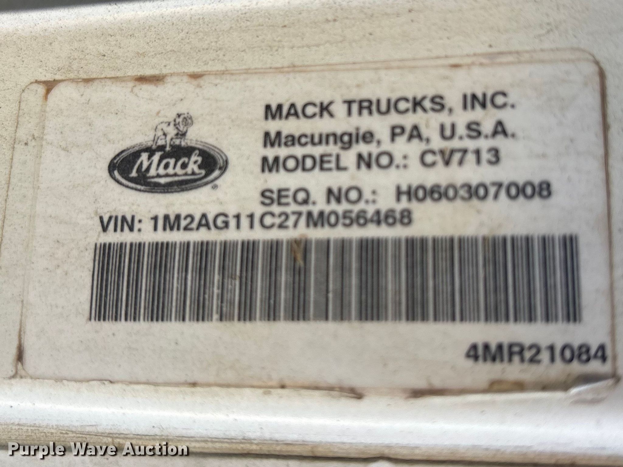 Purple Wave is selling a used Truck Tractor in Tennessee. This item is a 2007 Mack CV713 semi truck with the following: Miles: Unknown, VIN: 1M2AG11C27M056468