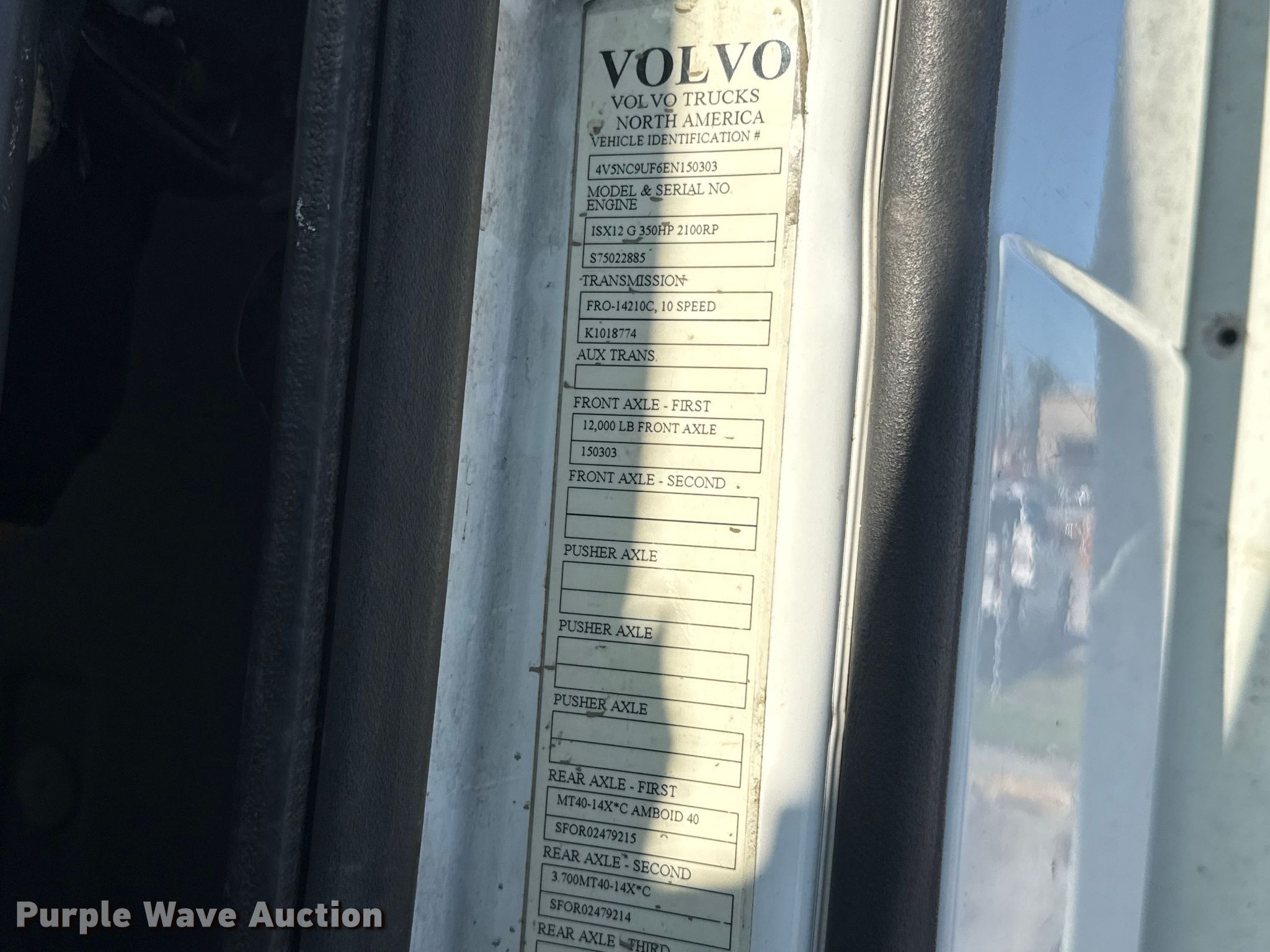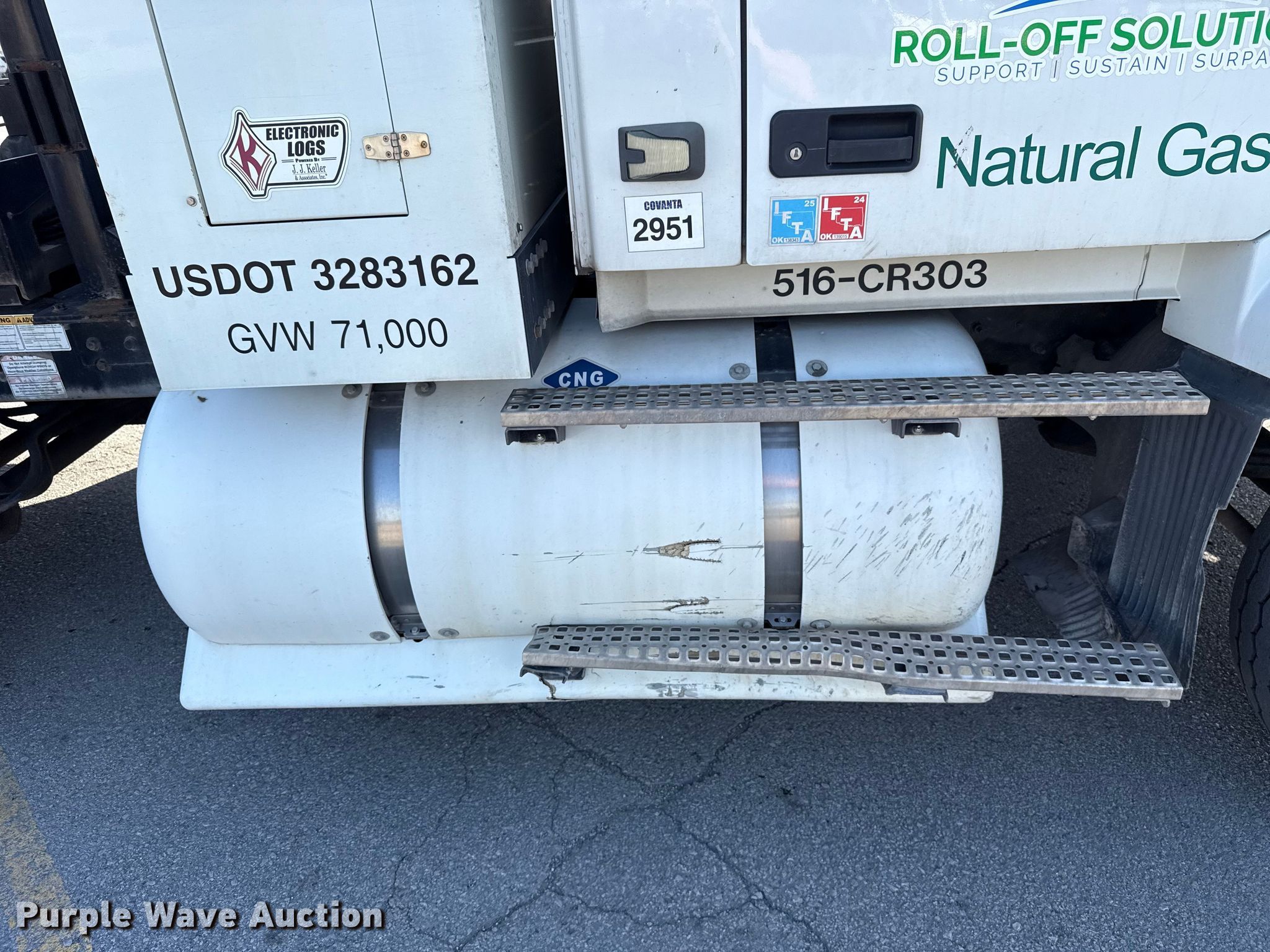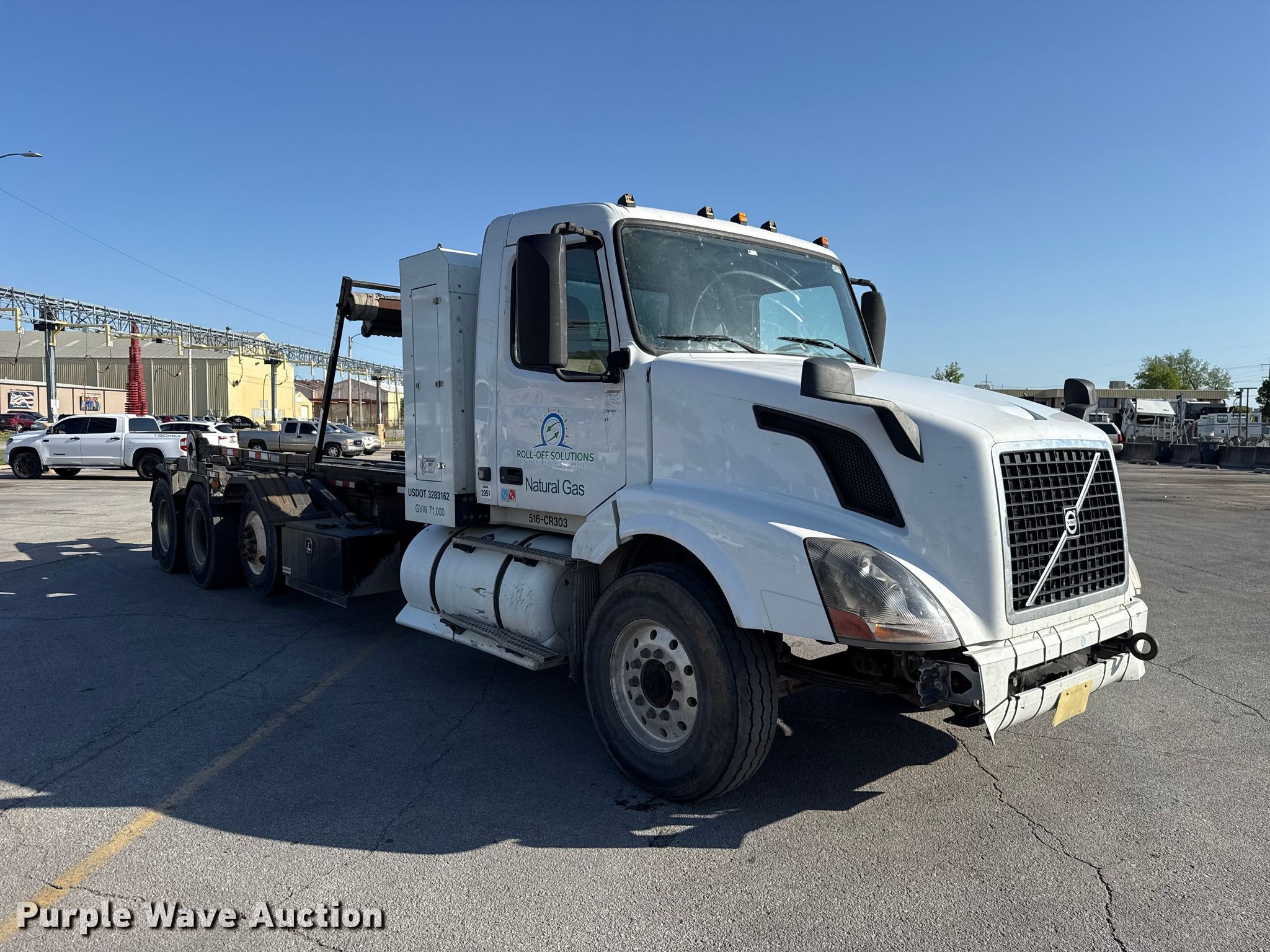 2014 Volvo VNL semi truck. Miles: 740,426 on odometer, VIN: 4V5NC9UF6EN150303, Unit #: 516-CR303. Engine Cummins ISX12, Serial: 75022885, Displacement: 11.9L, Cylinders: 6, Fuel type: CNG. Transmission Eaton Fuller, Manual, Speed: 10. Chassis Axles: Triple, Pusher axle, Differential lock: Inter-axle, Suspension: Air, Brakes: Air, PTO, Wet kit, GVWR: 50,000 lbs. Interior AC, Heat, Heated mirrors. Features Bed Roll-off bed, Galbreath U5-OR-174, Serial: 13H42376, Length: 23', Width: 36", Ram: Dual, Roll tarp, Winch. Tires Size: 315/80R22.5, Lift axle: 295/75R22.5. Notes Decals will be removed prior to auction, Dash warning indicator: Traction control, Windshield chipped or cracked. Oklahoma title. Title distribution may be delayed up to 14 days from verification of funds. Five Oak Exchange, LLC. Tulsa, OK 74107