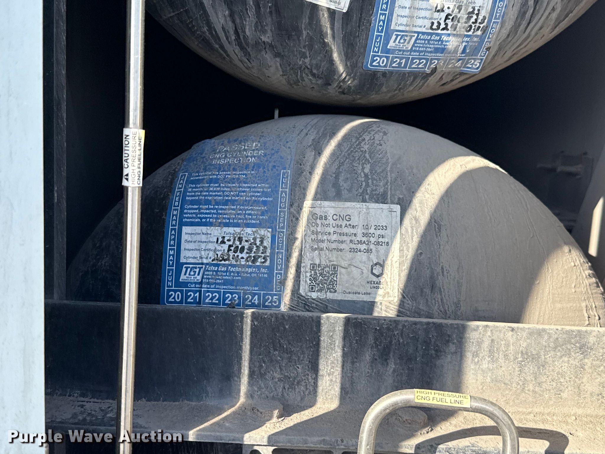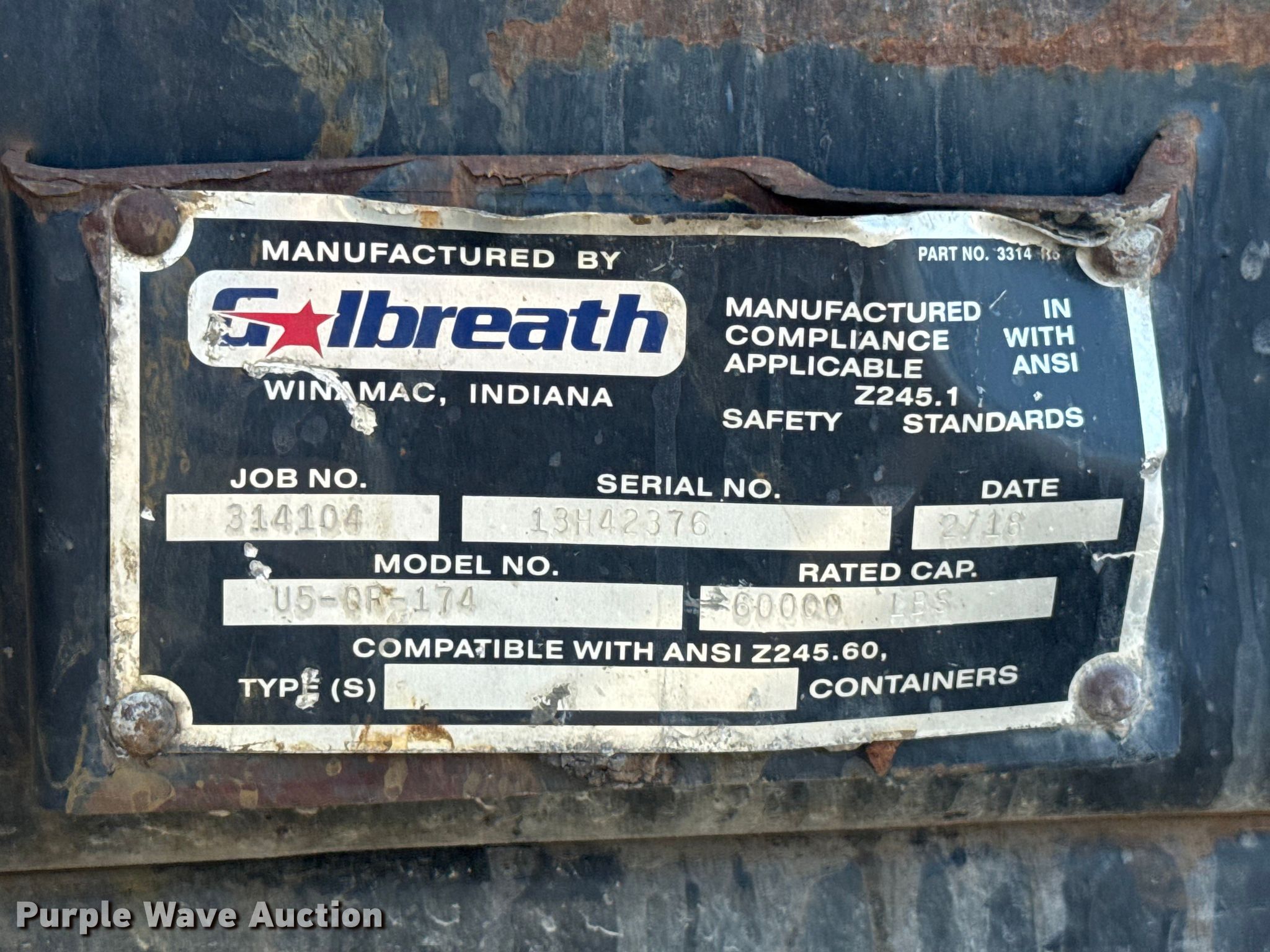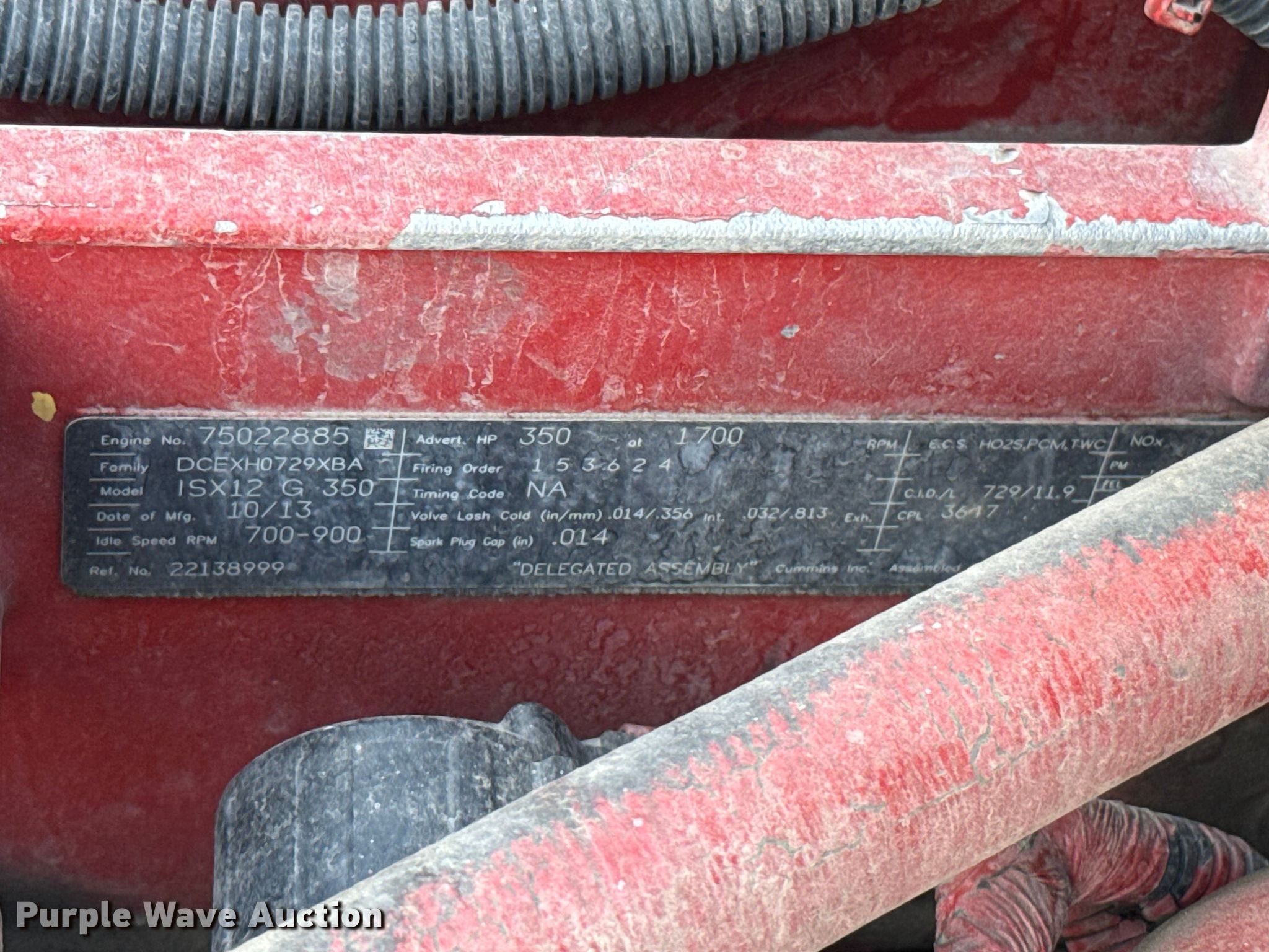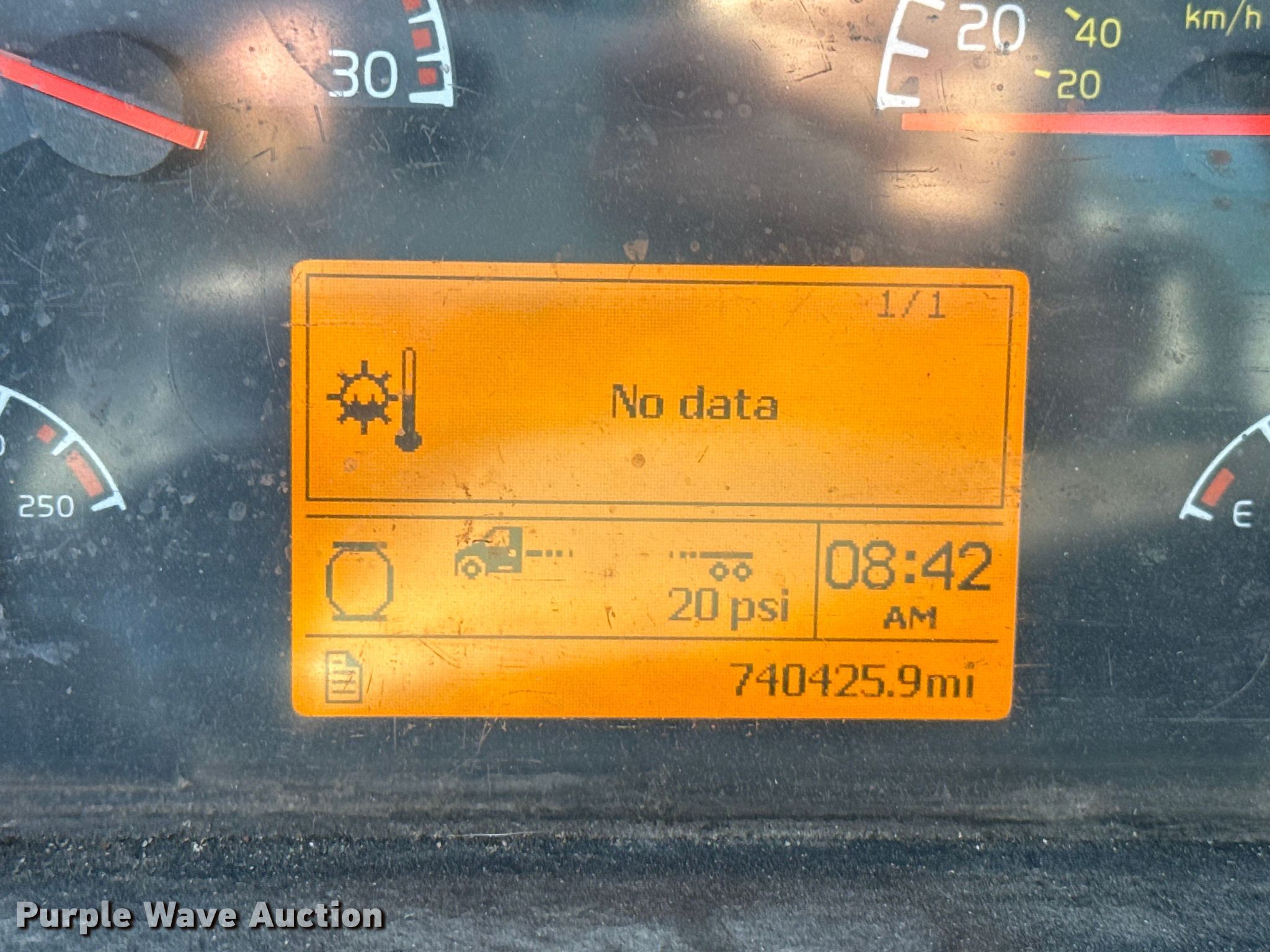 2014 Volvo VNL semi truck. Miles: 740,426 on odometer, VIN: 4V5NC9UF6EN150303, Unit #: 516-CR303. Engine Cummins ISX12, Serial: 75022885, Displacement: 11.9L, Cylinders: 6, Fuel type: CNG. Transmission Eaton Fuller, Manual, Speed: 10. Chassis Axles: Triple, Pusher axle, Differential lock: Inter-axle, Suspension: Air, Brakes: Air, PTO, Wet kit, GVWR: 50,000 lbs. Interior AC, Heat, Heated mirrors. Features Bed Roll-off bed, Galbreath U5-OR-174, Serial: 13H42376, Length: 23', Width: 36", Ram: Dual, Roll tarp, Winch. Tires Size: 315/80R22.5, Lift axle: 295/75R22.5. Notes Decals will be removed prior to auction, Dash warning indicator: Traction control, Windshield chipped or cracked. Oklahoma title. Title distribution may be delayed up to 14 days from verification of funds. Five Oak Exchange, LLC. Tulsa, OK 74107