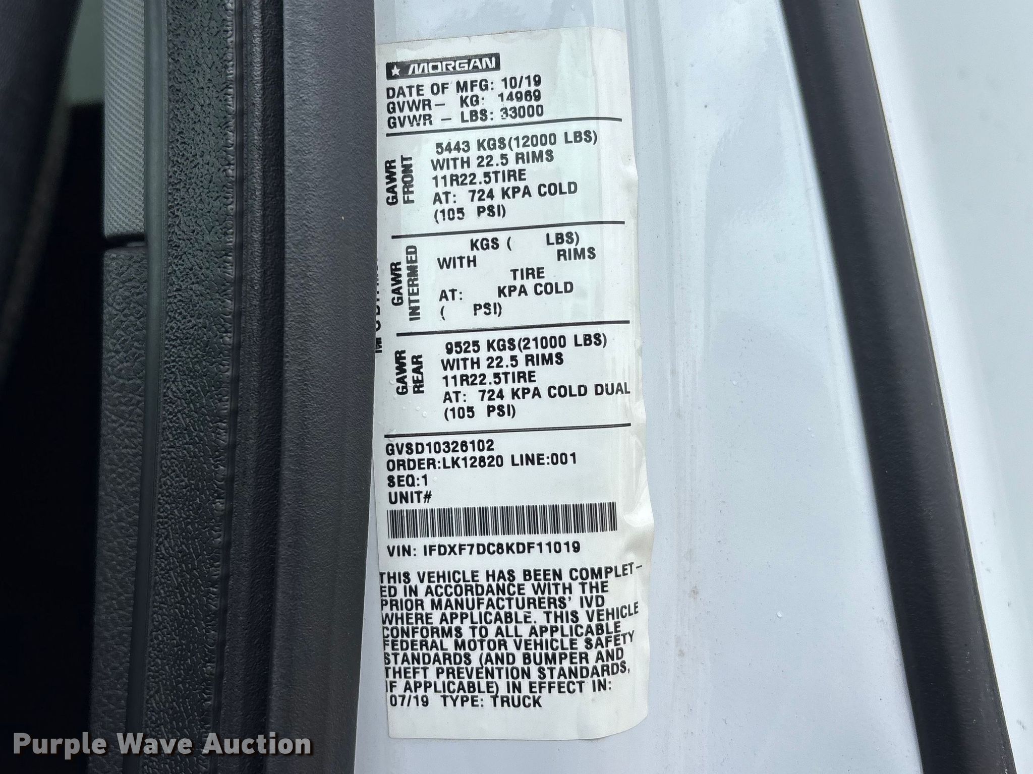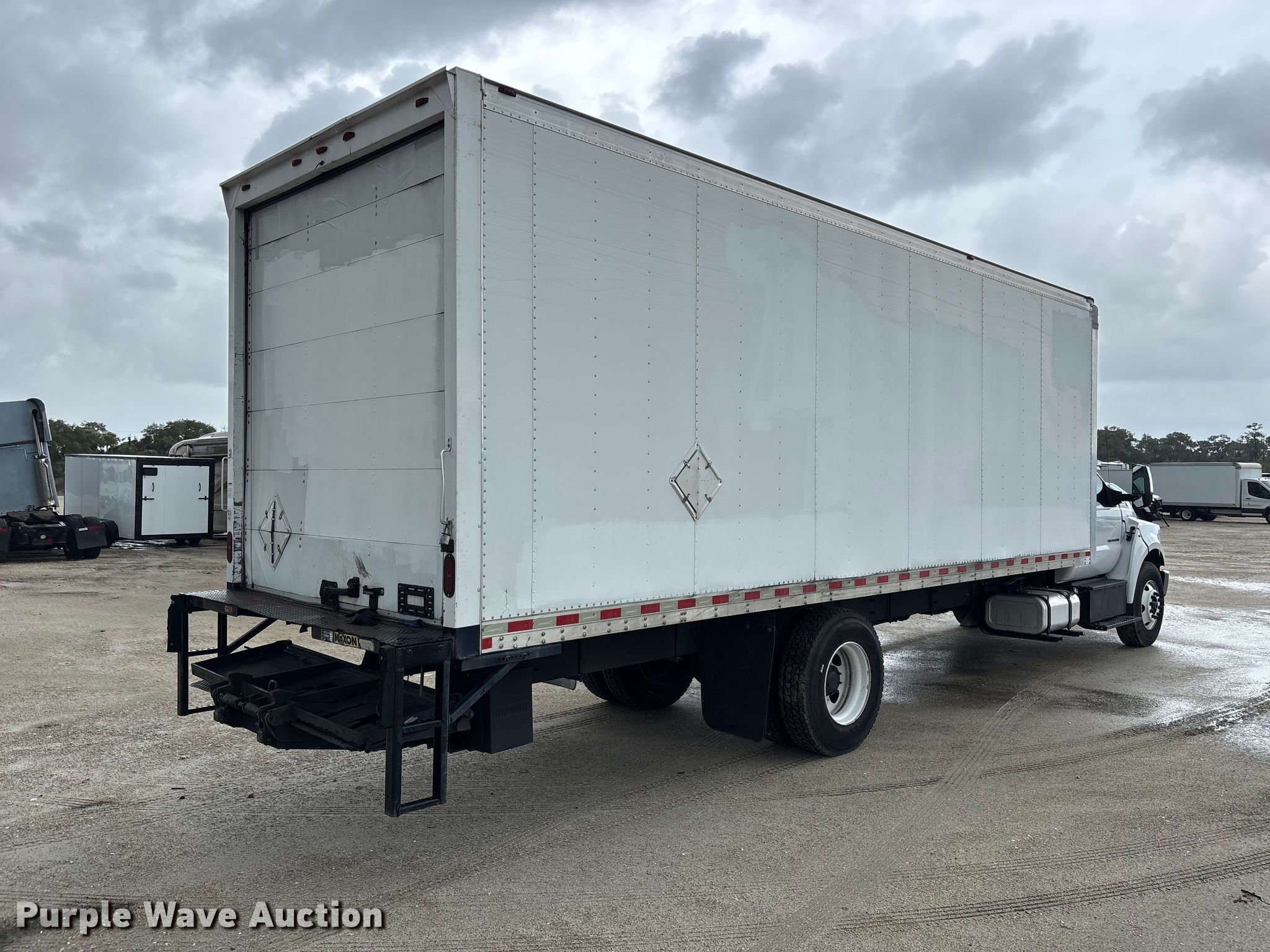 2019 Ford F750 Super Duty box truck. Miles: 327,286 on odometer, VIN: 1FDXF7DC8KDF11019, Unit #: 73088645. Engine Ford, Displacement: 6.7L, Cylinders: 8, Fuel type: Diesel. Transmission Automatic. Chassis Axles: Single, Suspension: Spring, Brakes: Air, GVWR: 33,000 lbs. Interior AC, Heat, Heated mirrors, Power windows, Power locks, Cruise control, Auxiliary controls. Features Bed Box bed, Morgan, Length: 26', Width: 102", Height: 103", E-track rail system, Floor: Wood, End gate lift, Maxon, Capacity: 2,500 lbs. Tires Size: 11R22.5. Repossessed item, stored at a secured facility. Please review REQUIRED REMOVAL INSTRUCTIONS. Titles will be distributed after confirmation of payment and removal. Florida title. Title distribution may be delayed up to 30 days from verification of funds. Lender Owned. 2601 Center Road. Fort Pierce, FL 34946