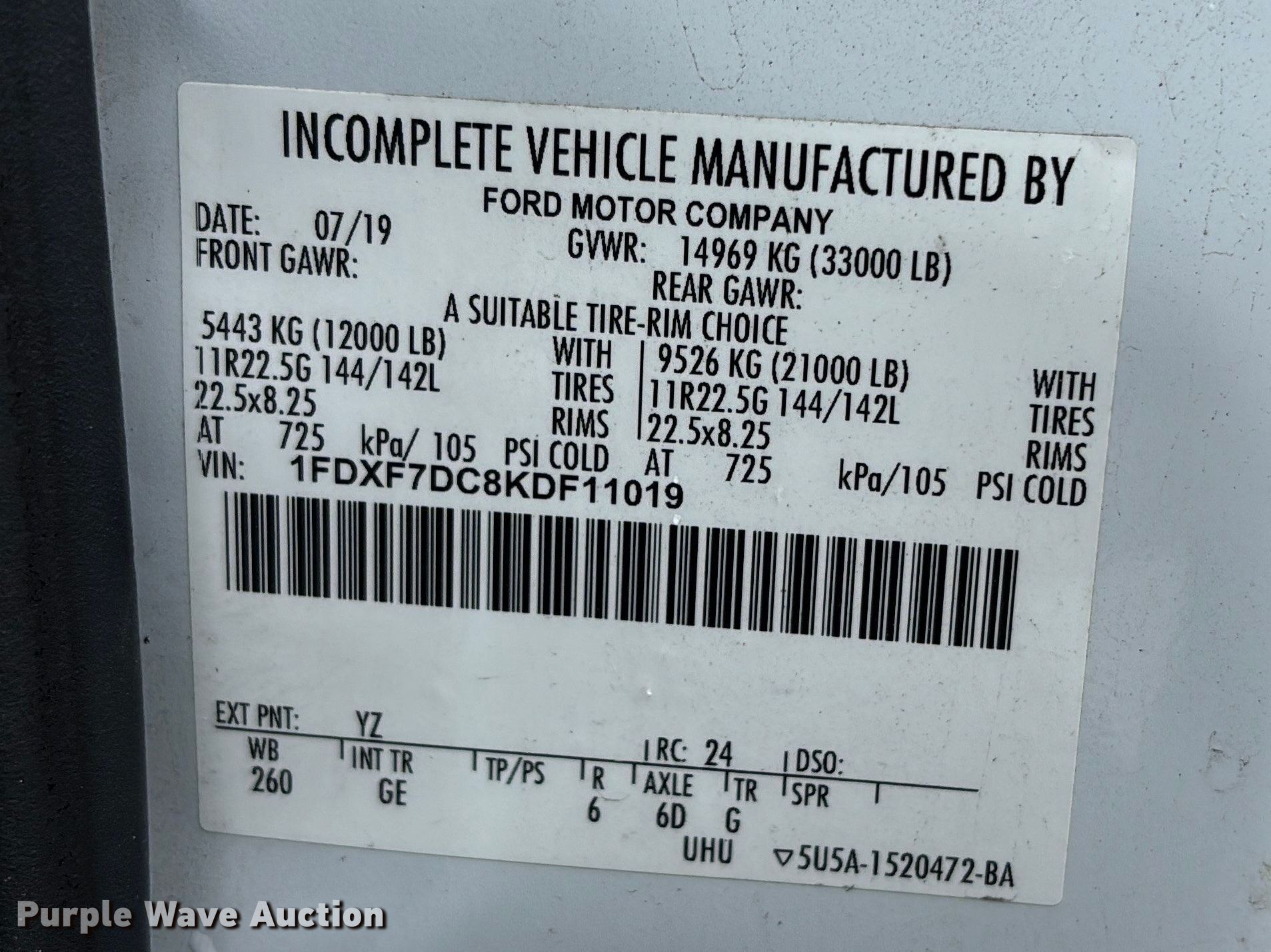 - VIN: 1FDXF7DC8KDF11019