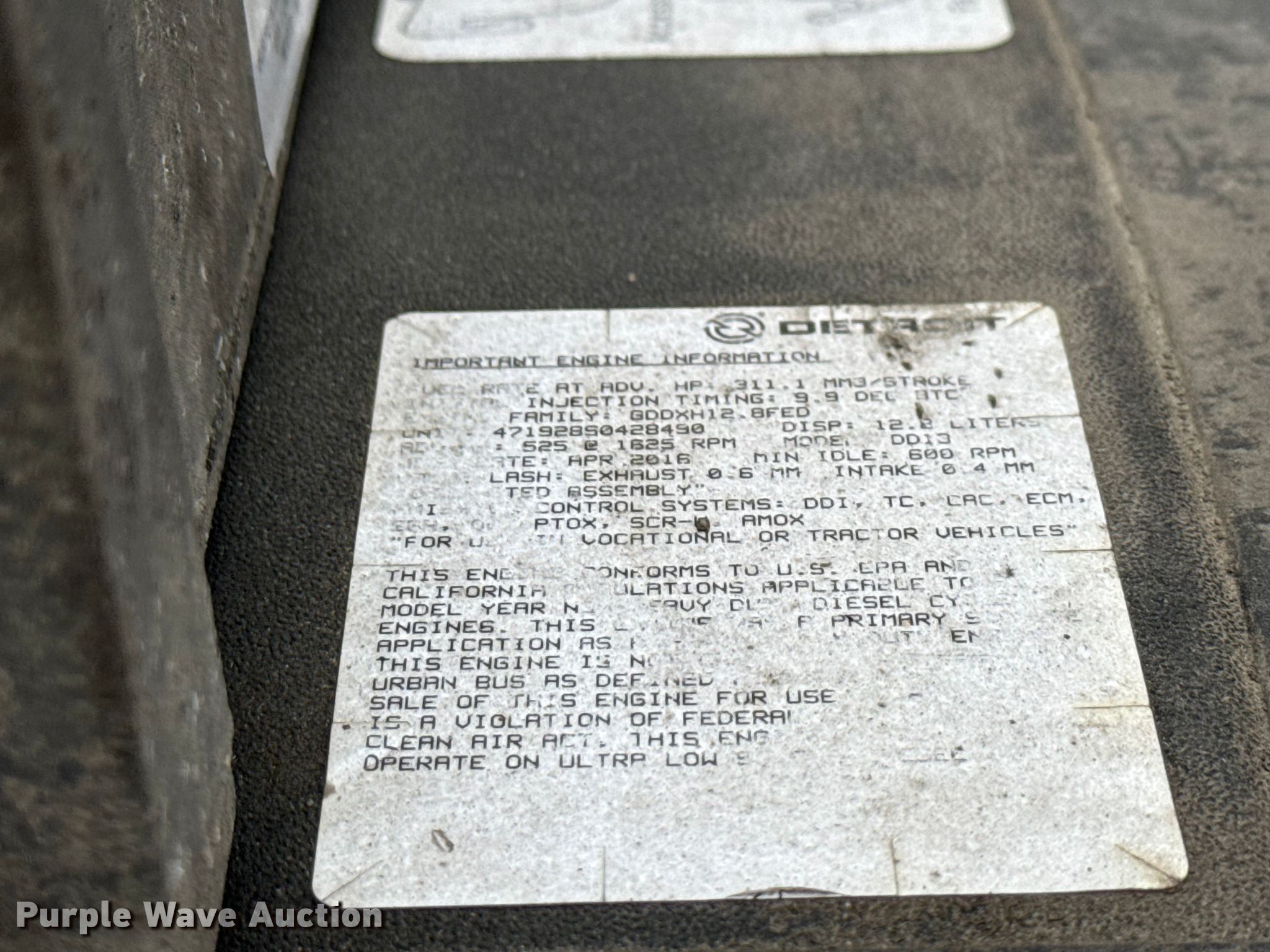 2017 Freightliner Cascadia 125 semi truck. Miles: 84,214 on odometer, VIN: 1FUJGEDV1HLJA8029. Engine Detroit Diesel DD13, Displacement: 12.8L, Cylinders: 6, Fuel type: Diesel. Transmission Automated manual. Chassis Axles: Tandem, Differential lock: Inter-axle, Suspension: Air, Brakes: Air, GVWR: 52,000 lbs, Wheelbase: 174". Interior AC, Heat, Heated mirrors, Cruise control, Air ride cab. Features Deck plate: Aluminum, Fifth wheel type: Fixed, Fuel tank: Dual. Tires Size: 295/75R22.5. Notes Dash warning indicator: Check engine, Dead battery, Key not included, Unit must be towed or hauled , Non-operational unit. Fleet realignment, stored at a secured facility. Please review REQUIRED REMOVAL INSTRUCTIONS. Titles will be distributed after confirmation of payment and removal. Indiana title. Mileage has not been verified. Odometer discrepancy will be marked on the title. Title distribution may be delayed up to 30 days from verification of funds. Standard Forwarding, LLC Strategic Fleet Realignment Sale. McFarland, WI 53558