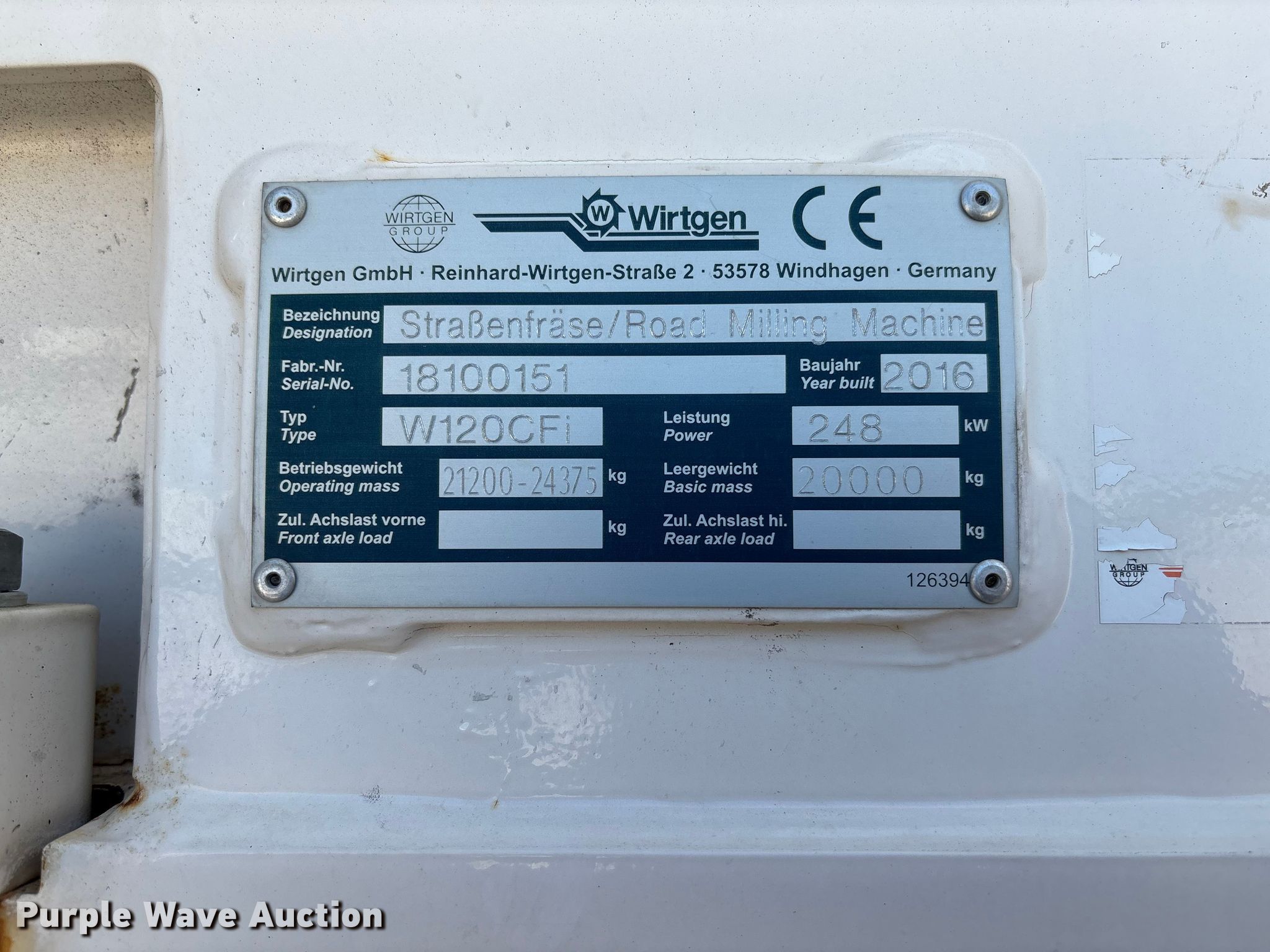 Take a look at this used 2016 Wirtgen W120CFi milling machine being sold on June 4th, 2026 in the Thursday June 04 Construction Equipment Auction made by Wirtgen. Take a look at all of the item information below or take a look at similar auctions for Asphalt and Paving Equipment.
